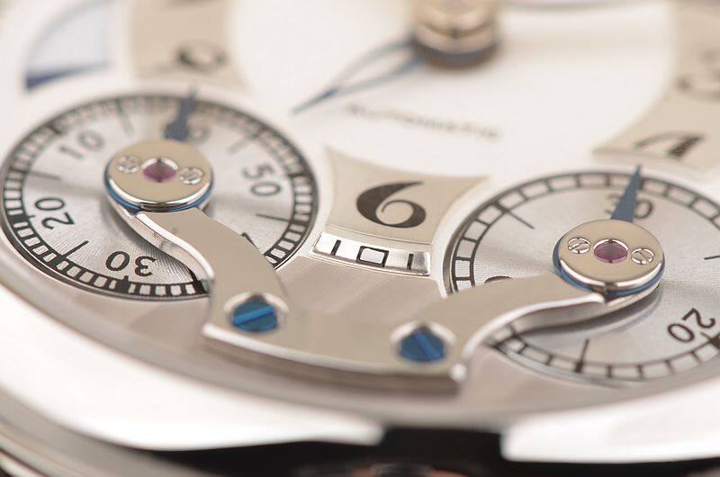 精钢表壳与折叠式表扣,蓝宝石水晶镜面及底盖。后配全新棕色皮表带。立体多层双色表盘,夜光时分针,蓝钢镂空GMT指针及计时秒针,3时位开窗日历显示,9时位第二时区昼夜显示,8时位单按钮计时功能。创新的旋转计时表盘设计。口径43MM*14MM。防水30M。