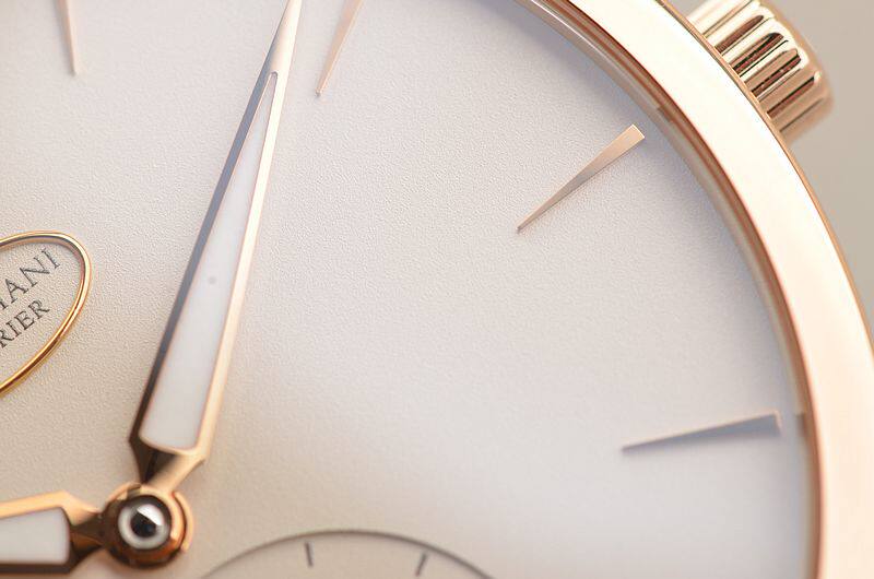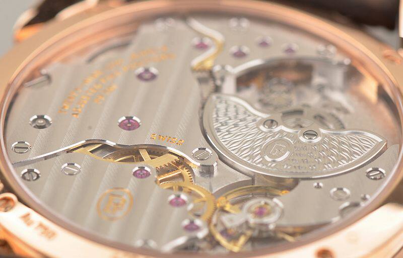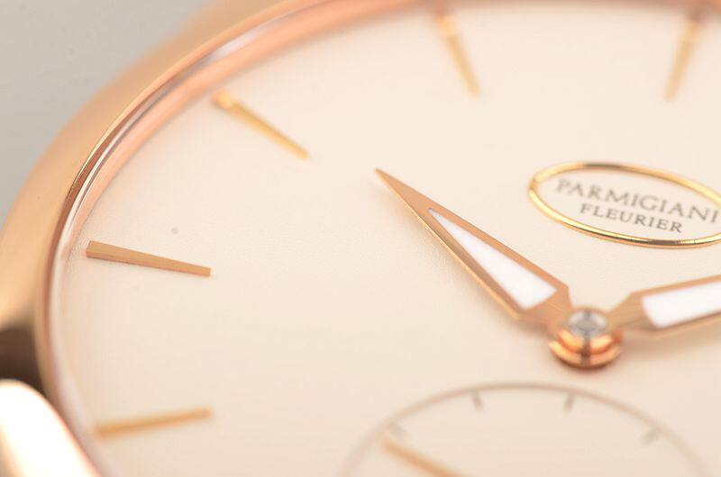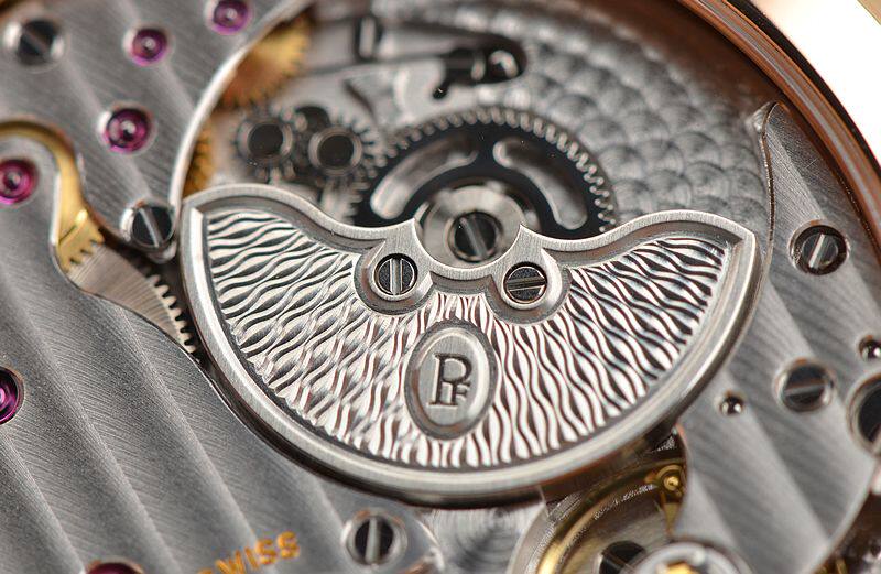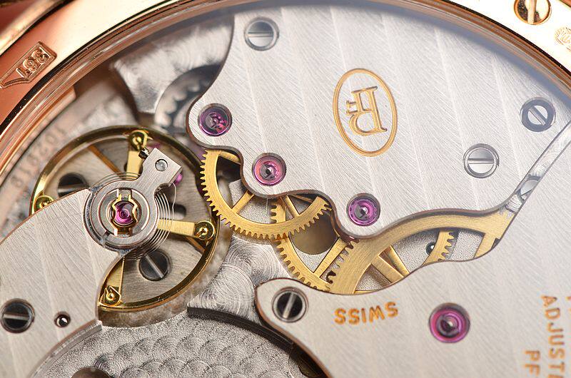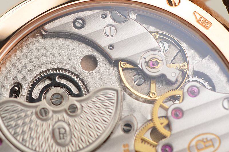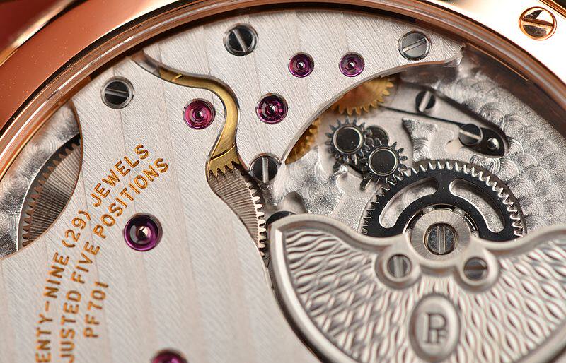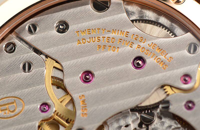 帕玛强尼自产的CAL.PF701机芯,自动机械,由145个零件组成。极其精致的日内瓦条纹及鱼鳞纹打磨,倒角抛光修饰,29钻,5方位校正,摆频21600。动力储存约42小时。走时状态极佳。