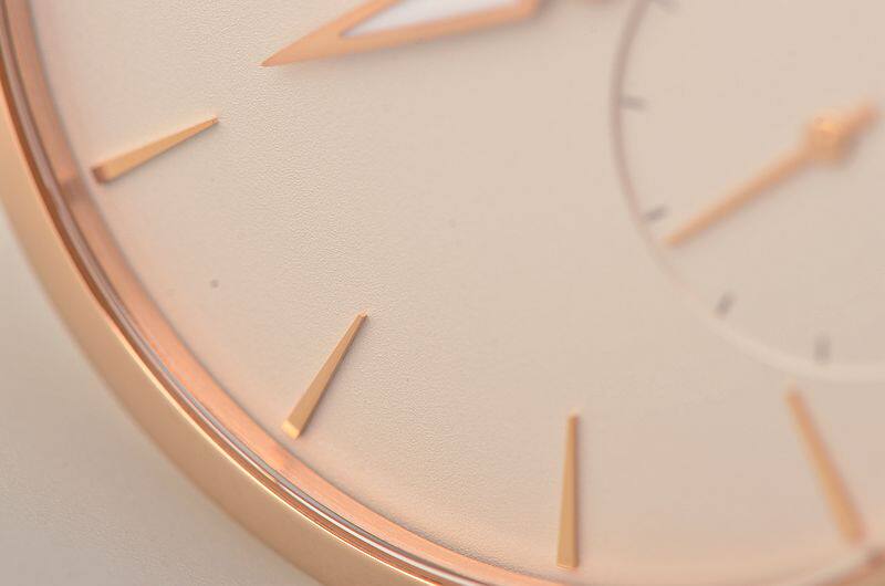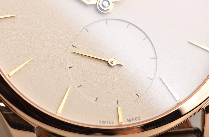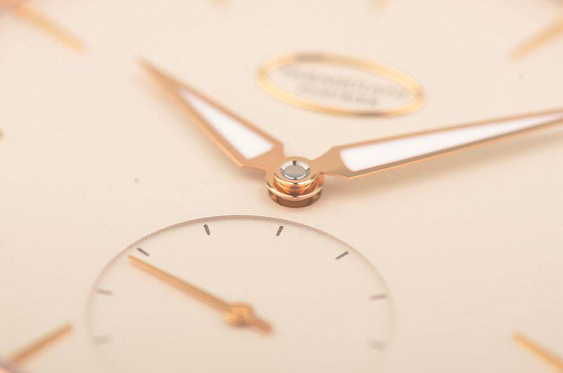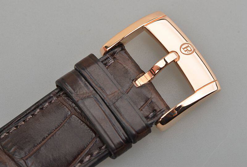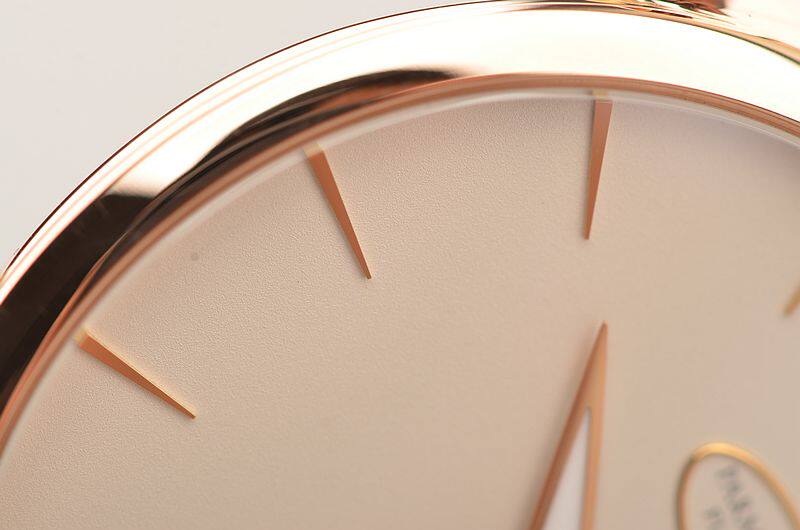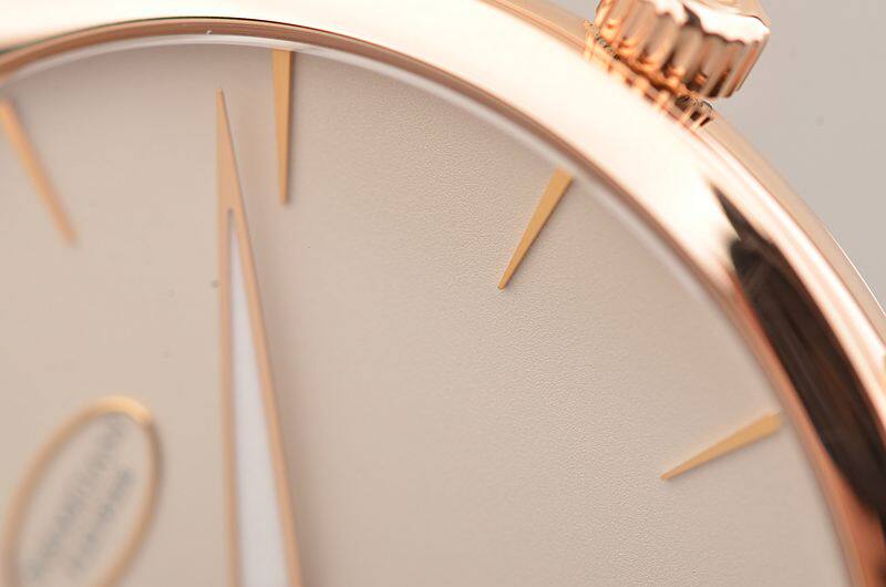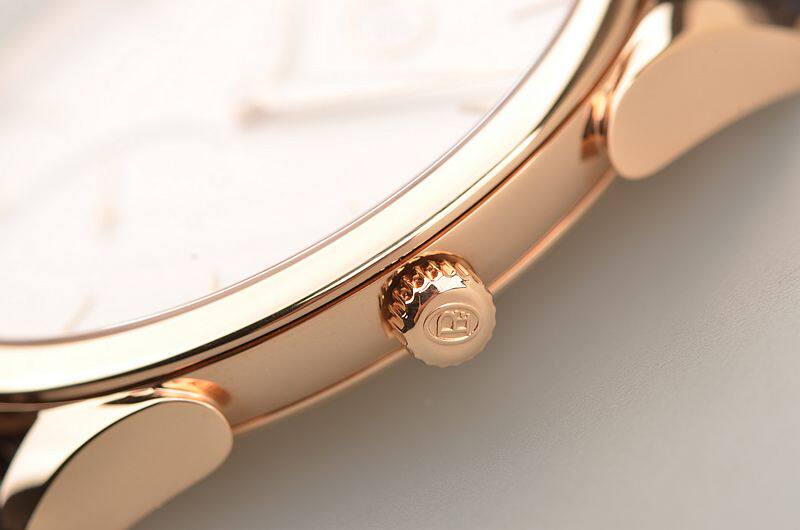 玫瑰金表壳及表扣,圣伯纳狗头印记。原厂棕色爱马仕HERMES鳄鱼皮表带成色很新。蓝宝石水晶镜面及底盖。立体奶油白色表盘,玫瑰金指针及刻度,夜光时分针。小三针设计。口径39MM*7.8MM。防水30M。