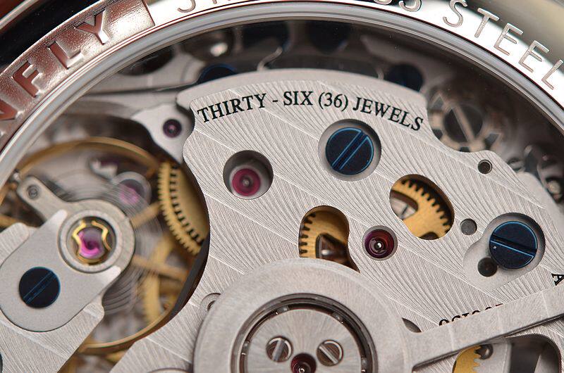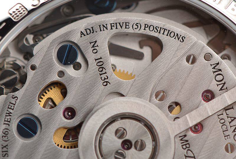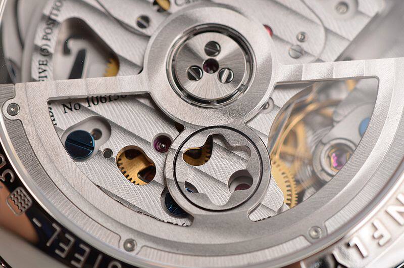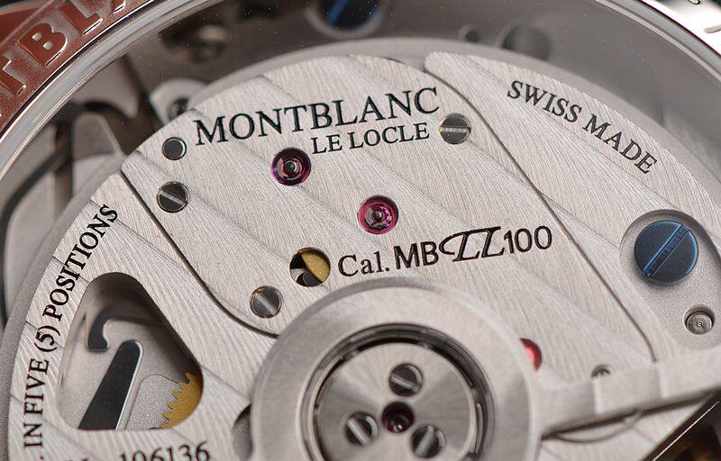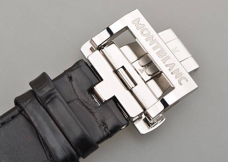 万宝龙自产的MB LL100机芯,自动机械,36钻,5方位校正,摆频28800。动力储存约72小时,属于长动力机芯。导柱轮控制,纵向盘型离合器,平卷游丝。镂空自动转陀,精美日内瓦条纹镀铑夹板。按个人手表方面的经验,这个机芯构造和打磨相当不错的。走时状态极佳。