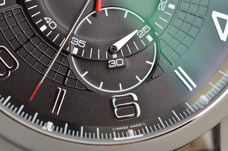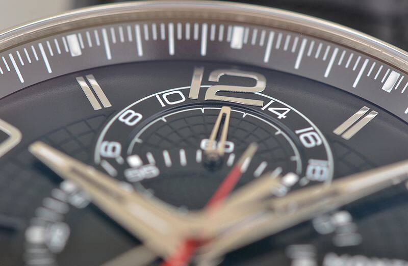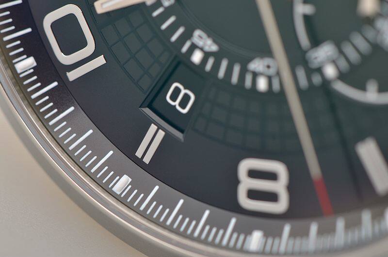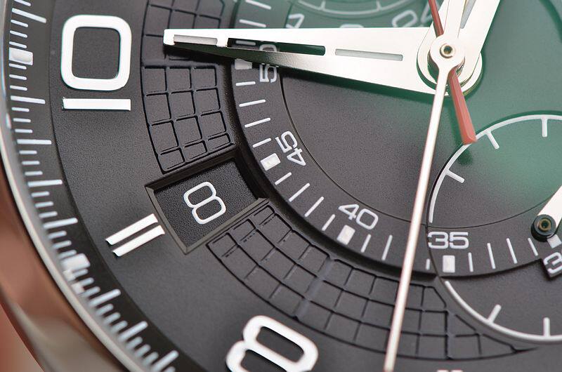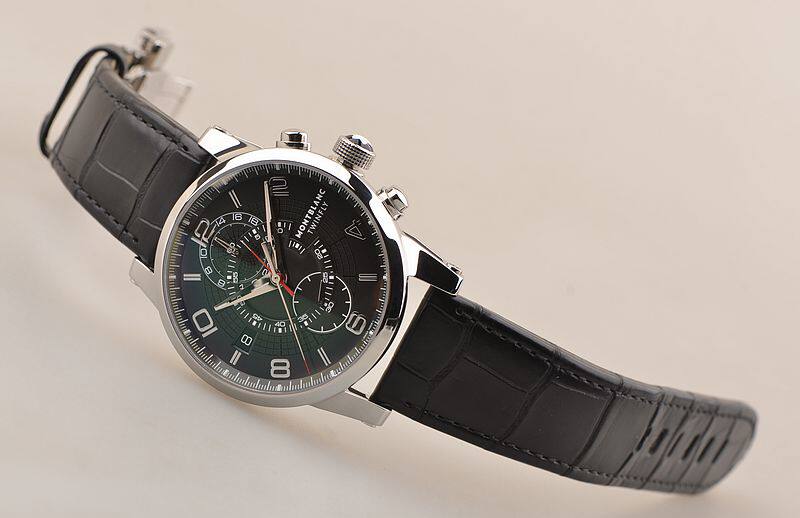 精钢表壳与按压式双向折叠表扣,蓝宝石水晶镜面及底盖。原厂黑色鳄鱼皮表带成色极新。立体黑色计时表盘,夜光时分针,阿拉伯数字刻度外圈亦有夜光显示,9点位日历显示,口径43MM*15.3MM。防水30M。