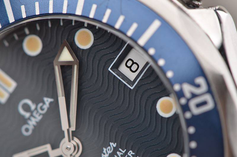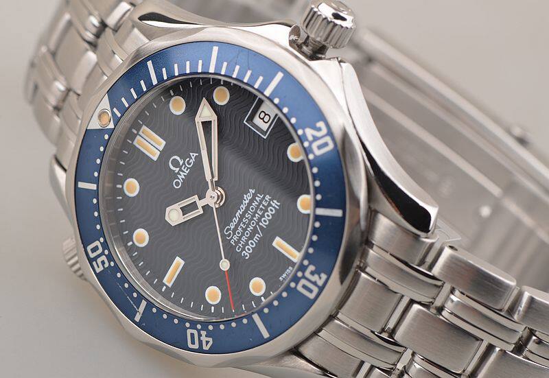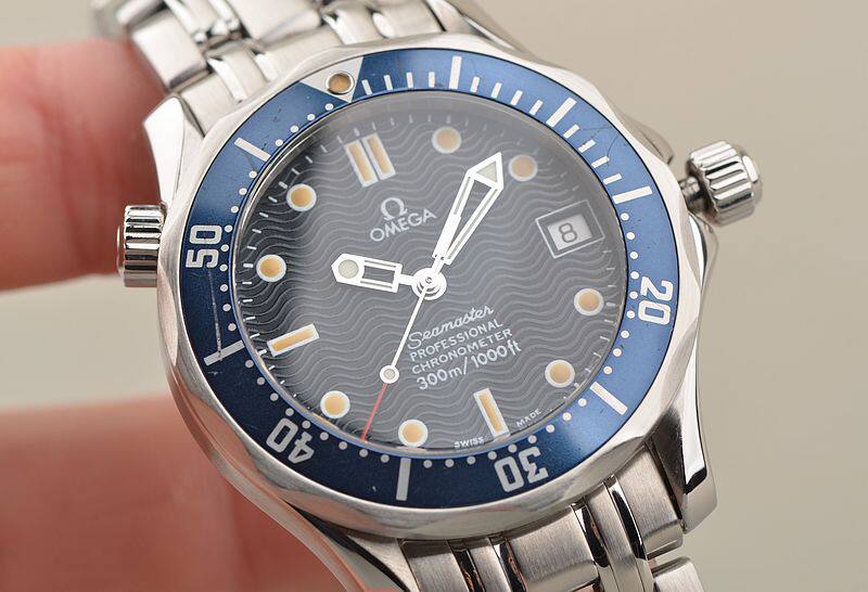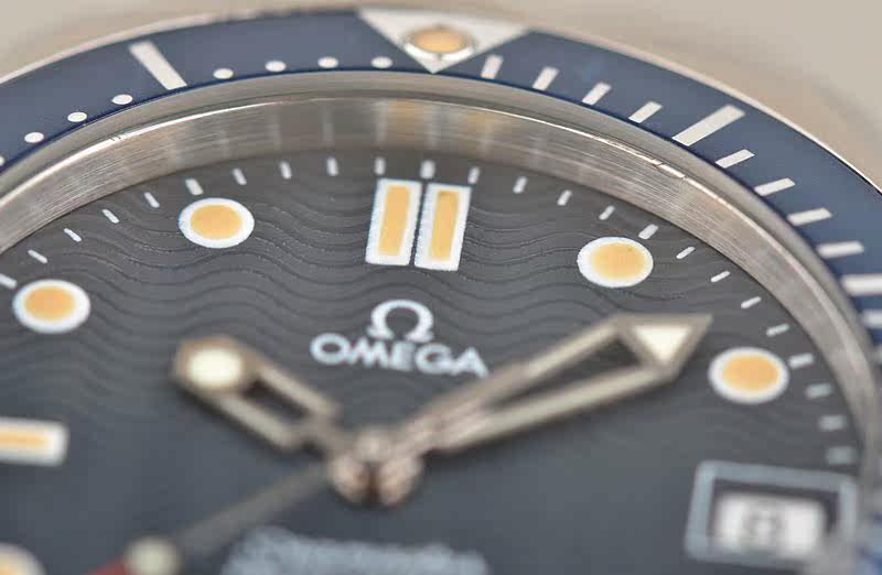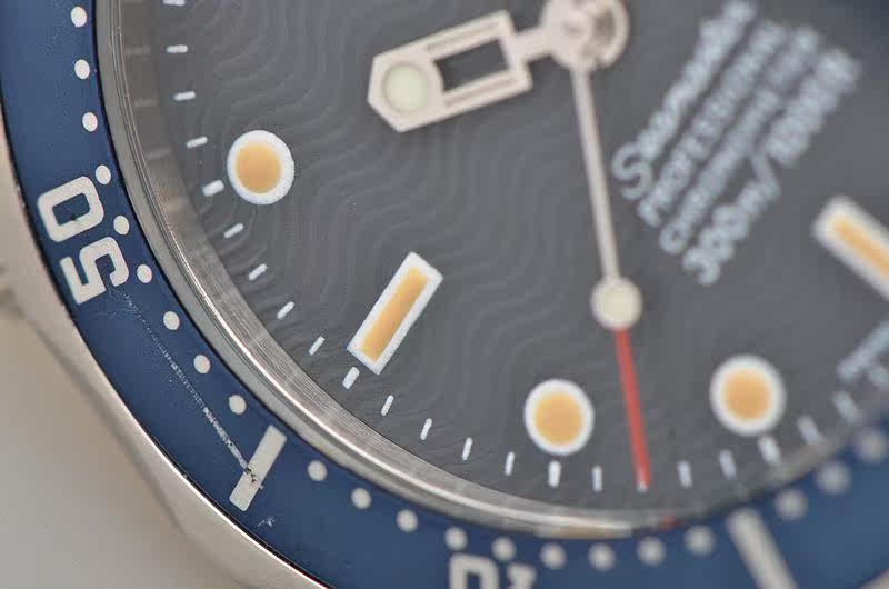 精钢表壳及链带,按压式折叠表扣。蓝色单向旋转计时表圈,表壳侧面10点位表冠排氦气阀门装置。蓝宝石水晶镜面,立体蓝色波浪纹表盘,夜光指针及刻度,3点位日历显示功能。旋入式防水表冠。口径36.25MM*12MM,防水300M。