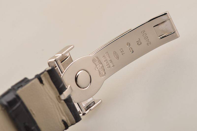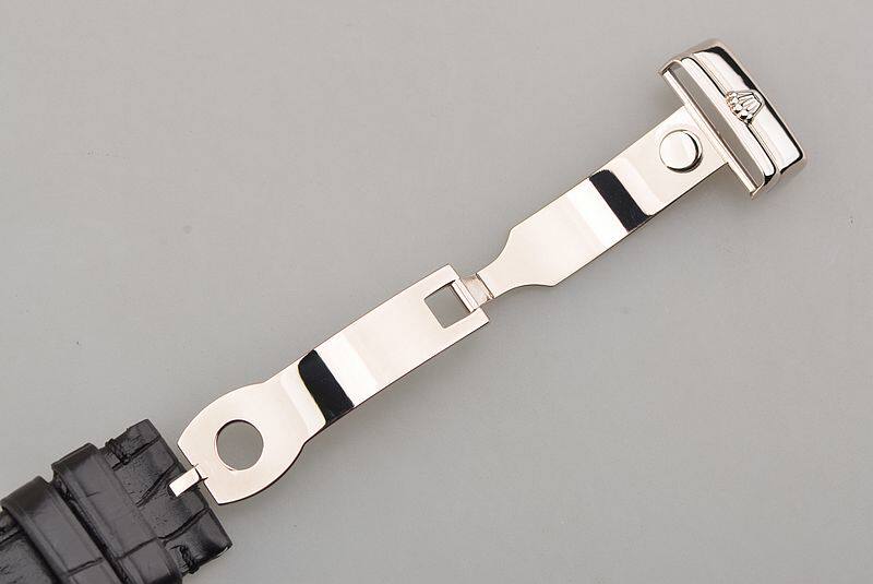 18K白金表壳及折叠表扣。圣伯纳狗头印记。后配全新黑色鳄鱼皮表带。蓝宝石水晶镜面,白金夜光指针及黑玛瑙刻度。路轨式分钟刻度盘。口径38MM*46MM*7MM,相当于圆表40MM口径。属于切利尼大号的表款。防水30M。