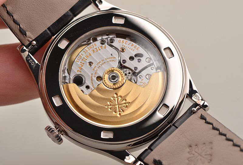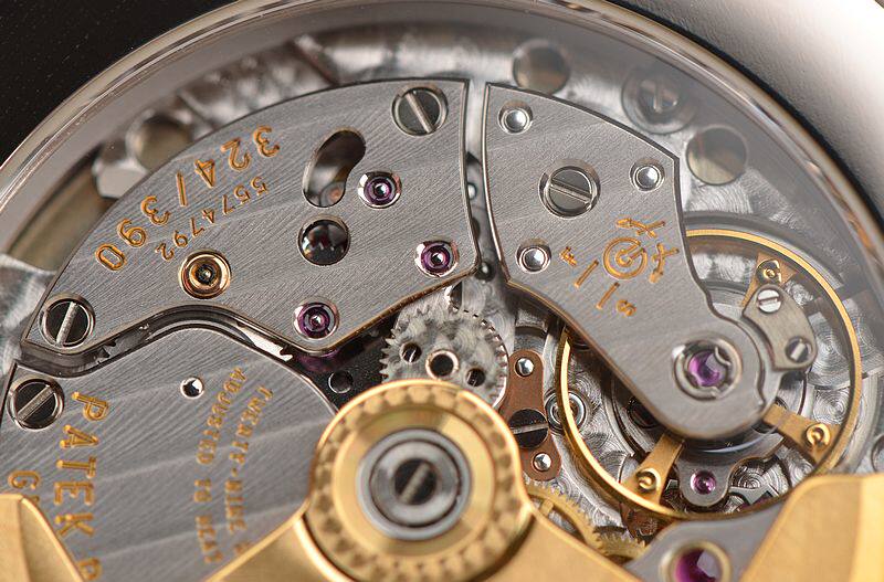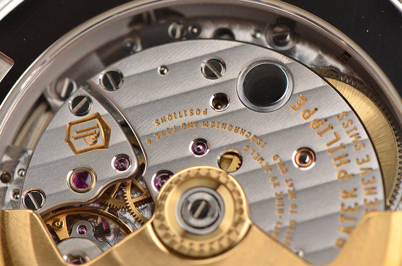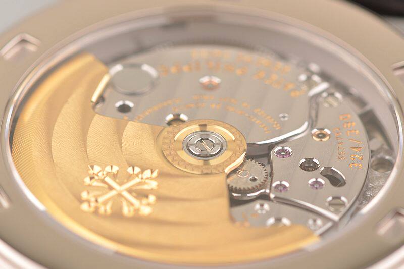PP自产的CAL.324SC机芯,PP印记,自动机械,由213个零件组成,29钻,摆频28800,黄金镌刻LOGO自动摆陀,6方位校正,极其精细日内瓦手工条纹打磨,倒角抛光修饰,动力储存约45小时。走时状态极嘉。