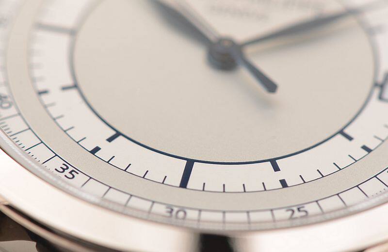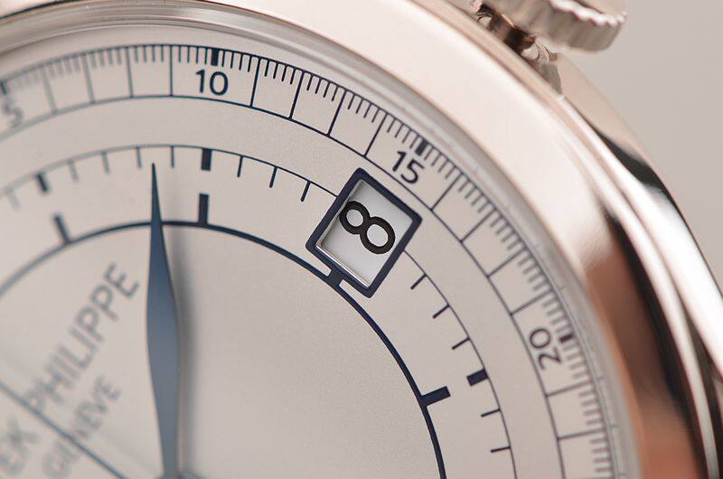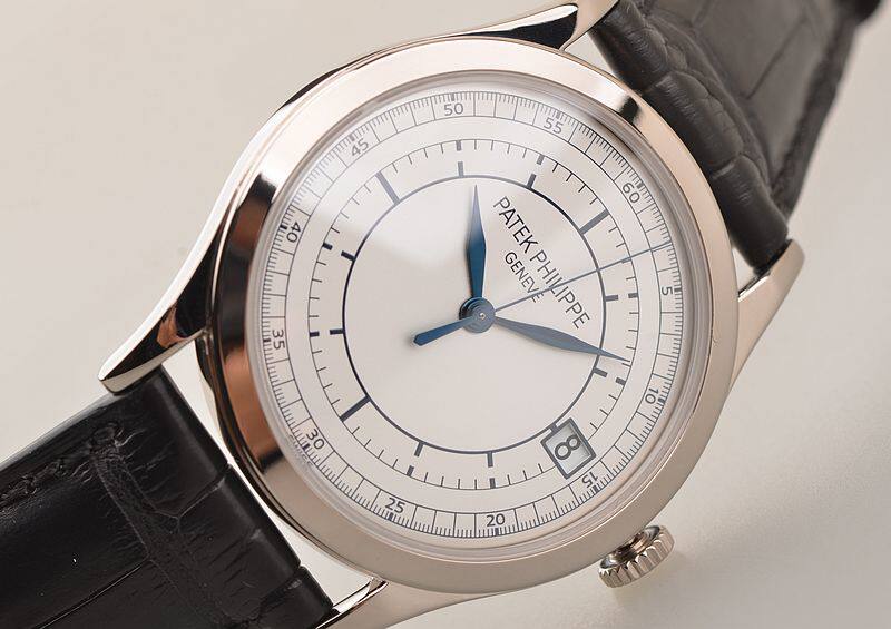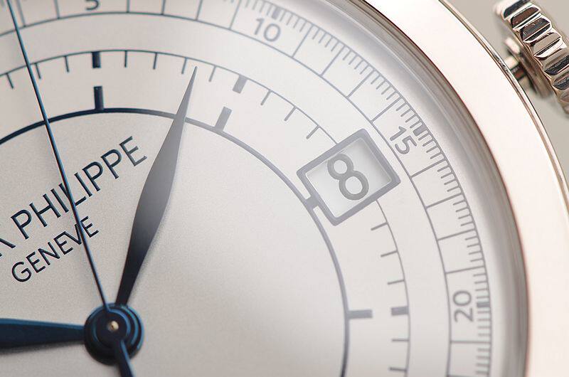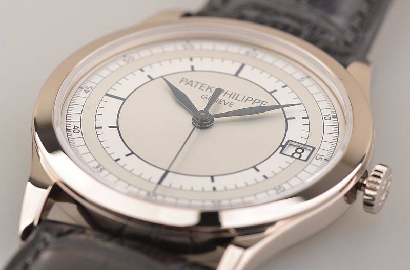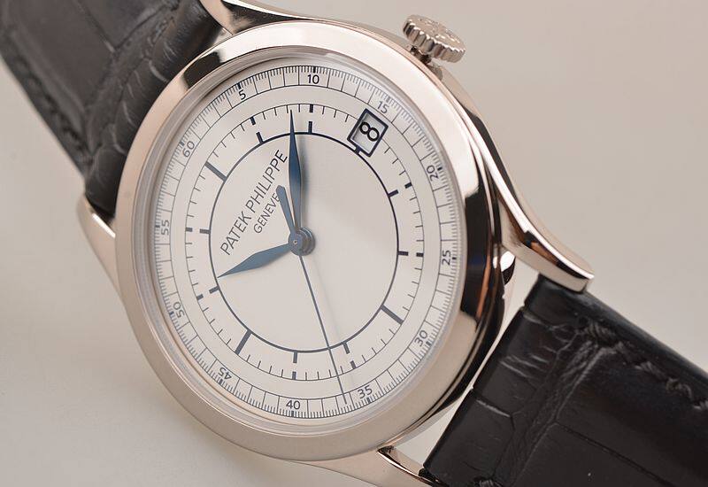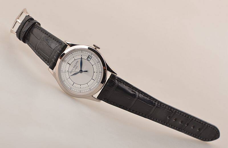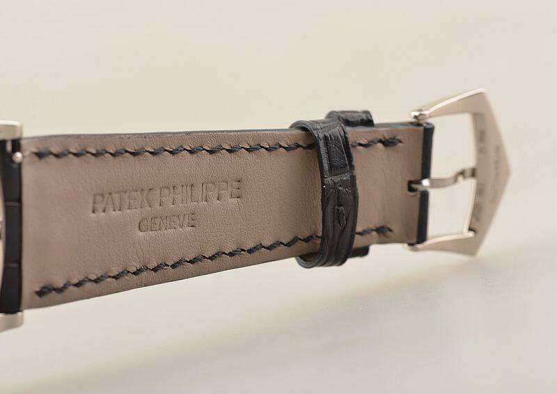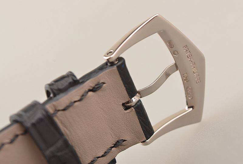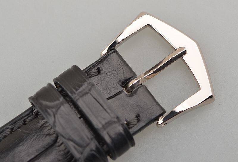 18K白金表壳及表扣,圣伯纳狗头印记。后配全新黑色鳄鱼皮表带。蓝宝石水晶镜面及底盖,立体银白色轨道面表盘(经典热门),3时位日历显示。蓝钢指针。口径38MM*8.5MM。防水30M。