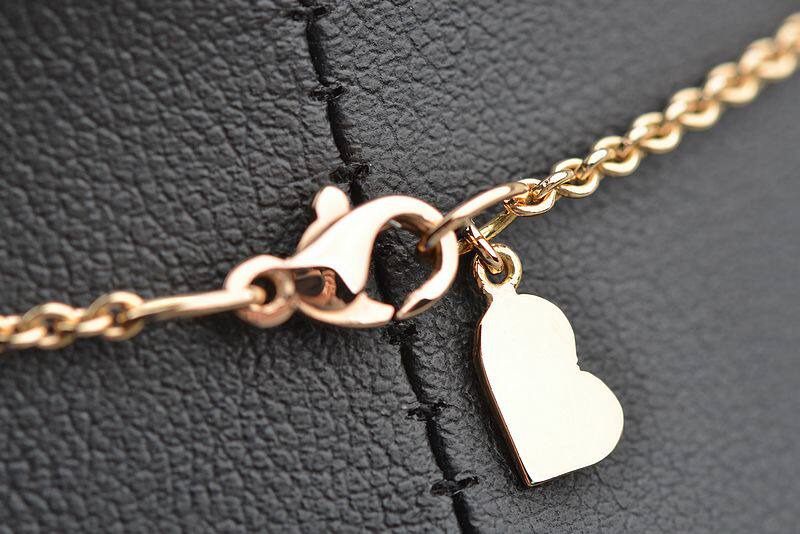 18K玫瑰金项链,独具匠心的线条设计,诉说一段不朽的爱情故事。与之搭配18K玫瑰金镶钻心形吊坠,展现风情万种的一颗芳心。