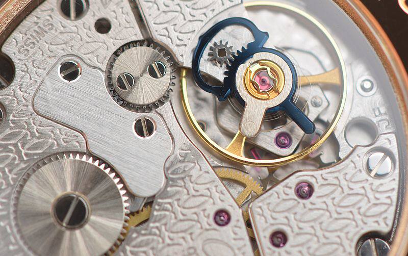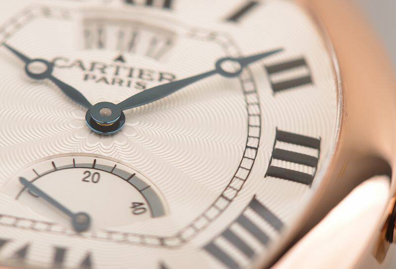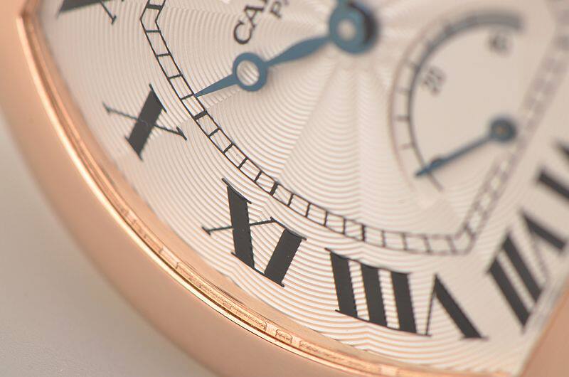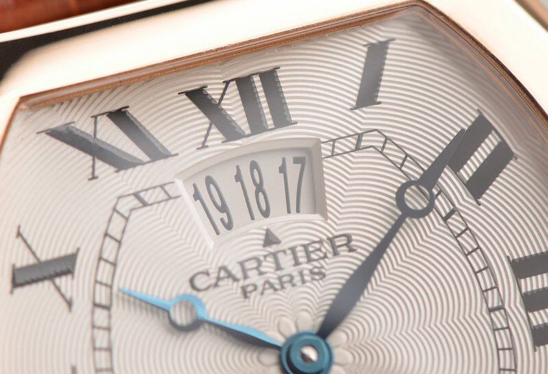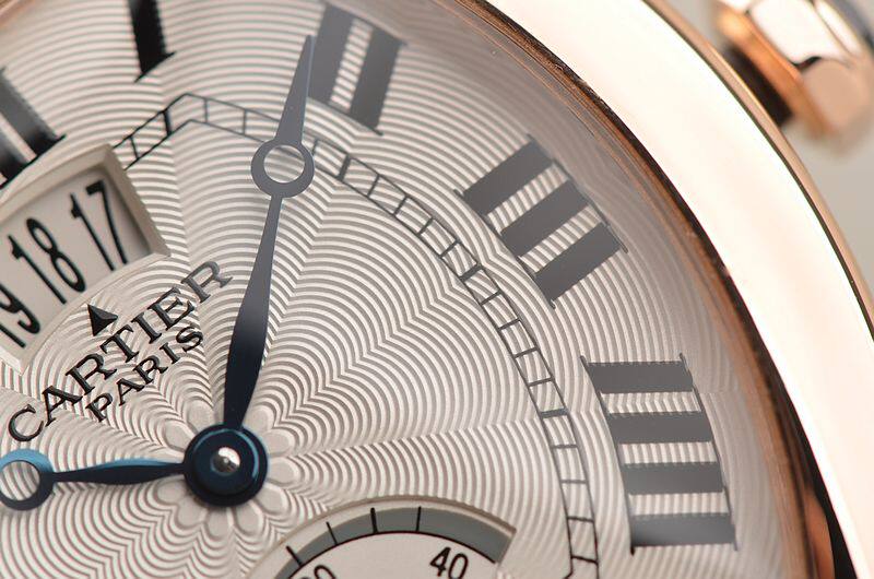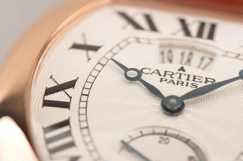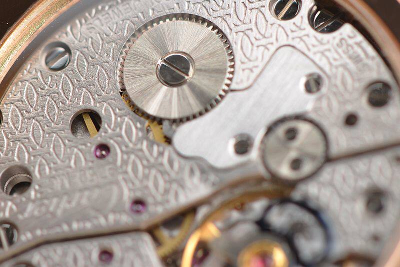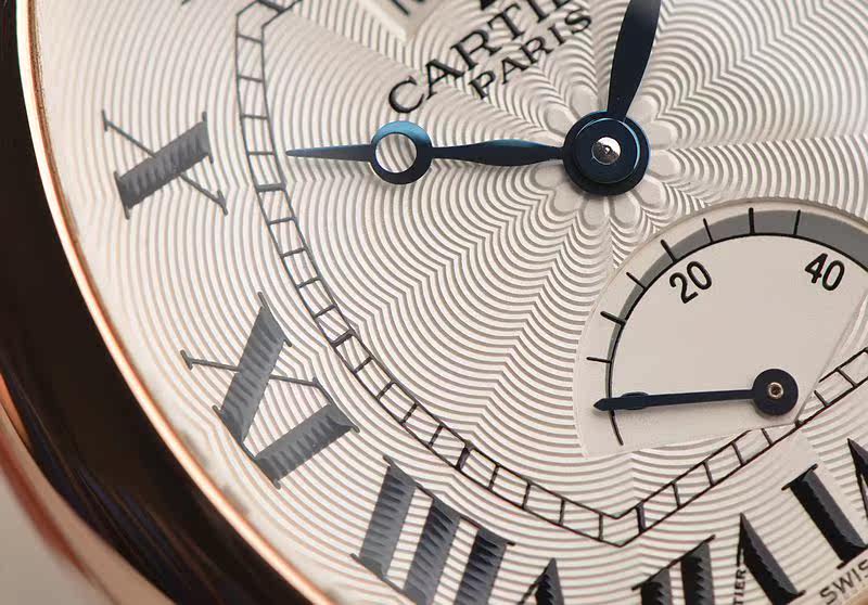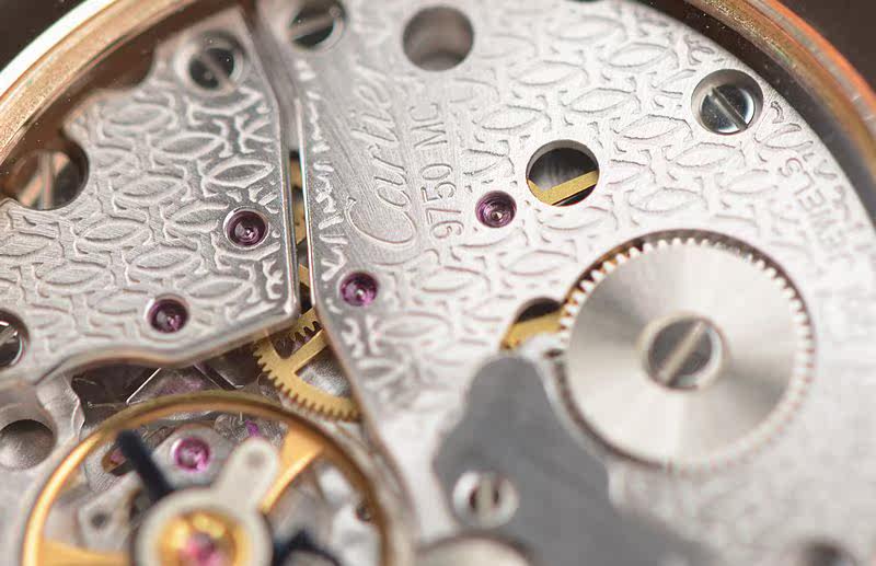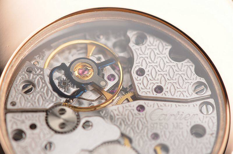 卡地亚自产CAL.9750MC型机芯,巴黎工坊机芯,代表着最高技艺的人手打磨,倒角抛光修饰。卡地亚LOGO饰纹机芯夹板,20钻,摆频21600,动力储存约40小时,走时状态极佳。