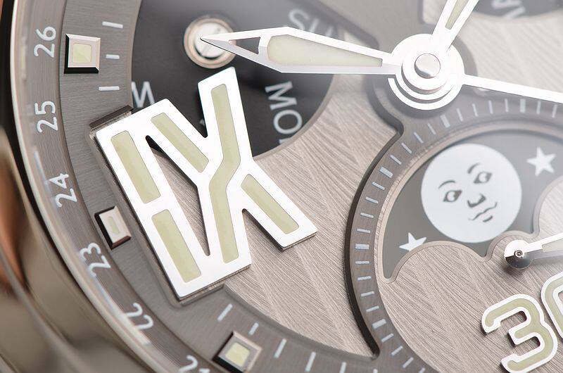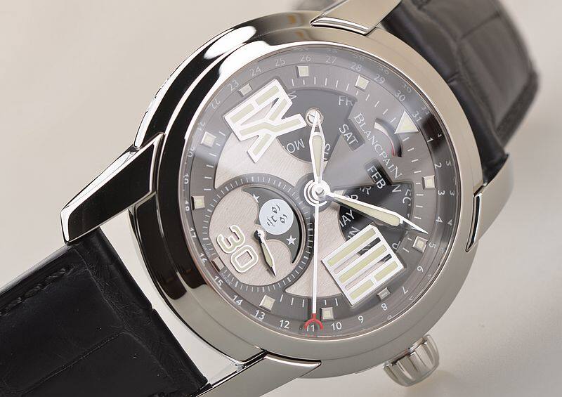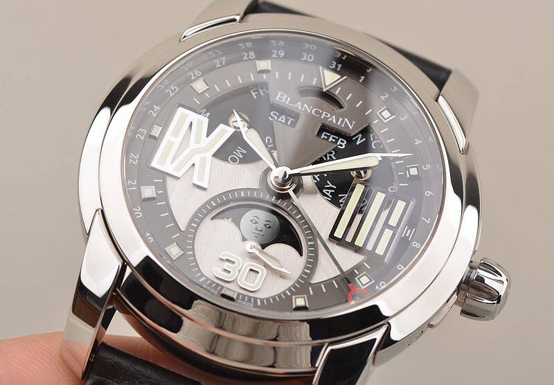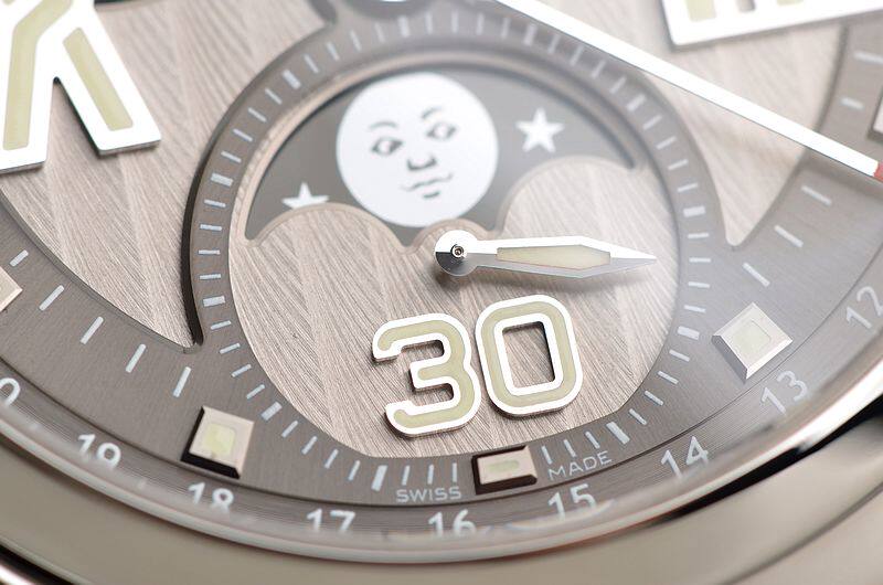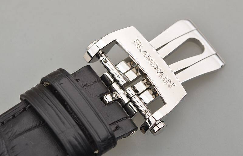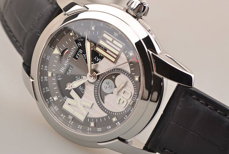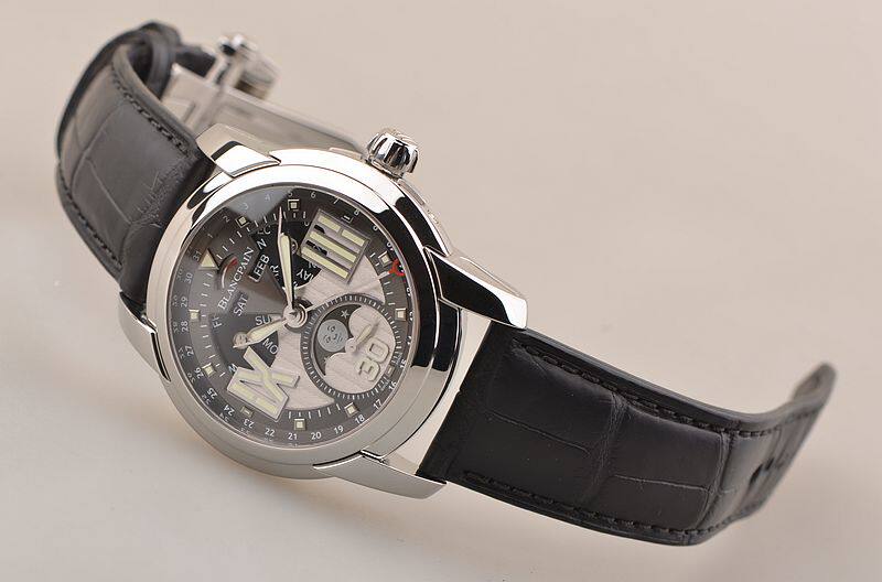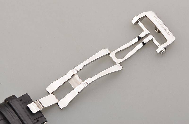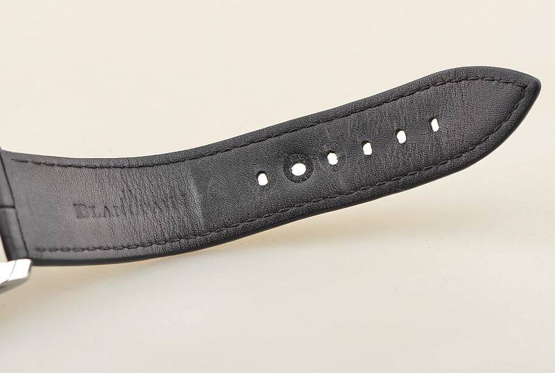 精钢表壳及折叠式表扣,后配黑色鳄鱼皮表带成色很新。蓝宝石水晶镜面及底盖,立体黑色表盘,夜光指针及刻度,全历,月相功能。12点位动能储备显示。旋入式防水表把。口径43.5MM*15.55MM。防水100M。