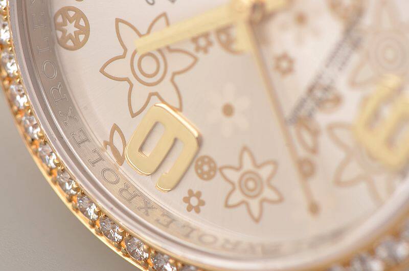 18K黄金及904L精钢表壳及链带,折叠式表扣。18K黄金镶钻表圈镶嵌原厂52颗天然美钻。银色拉丝花朵表盘,黄金刻度及指针,3点位放大镜日历视窗。旋入式防水表冠。口径36MM*12.6MM。防水100M。