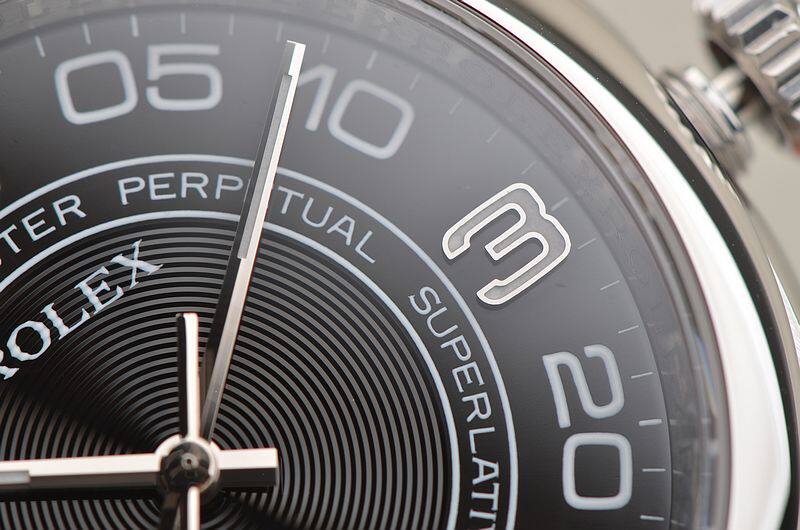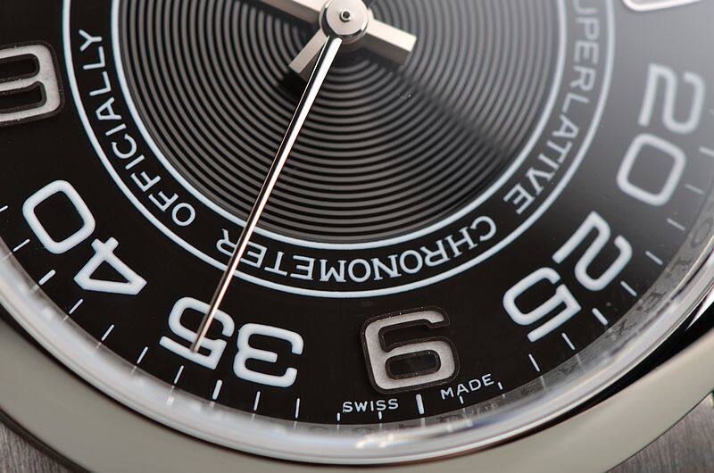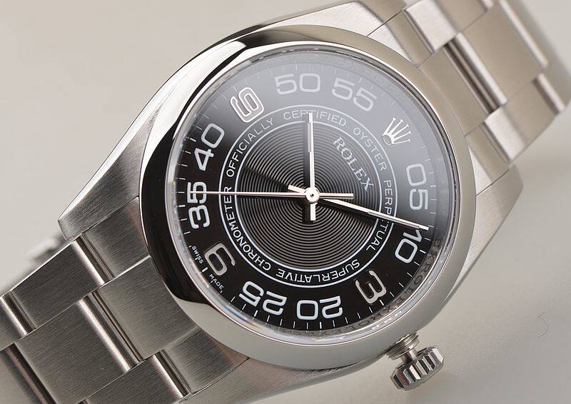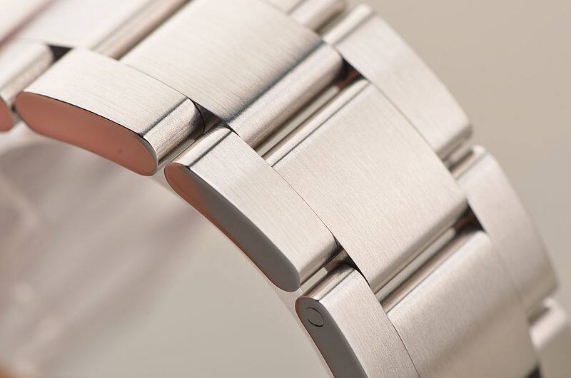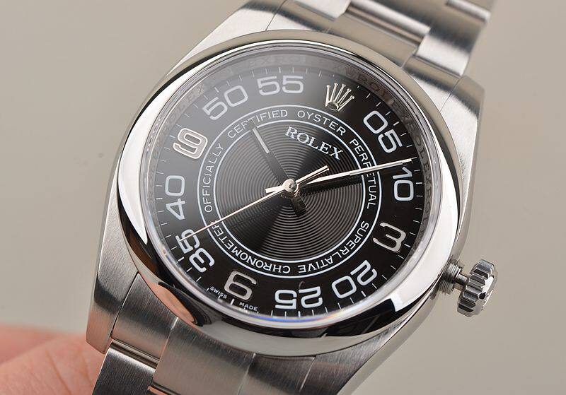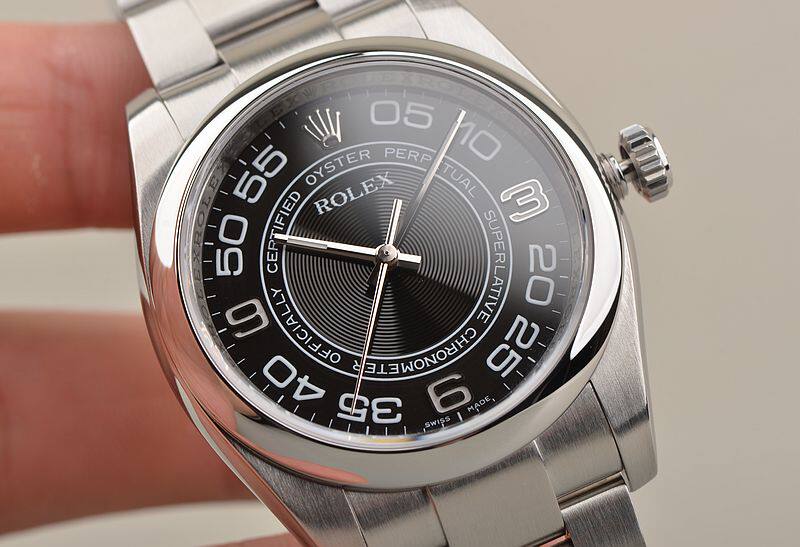 904L精钢表壳及链带,折叠式表扣。蓝宝石水晶镜面,立体黑色同心圆纹表盘,18K白金指针,时分针及3、6、9时标有夜光,大三针设计,天文台认证标示。口径36MM*11.6MM。旋入式防水表把。防水100M。