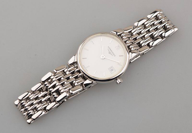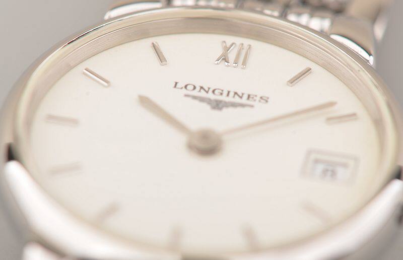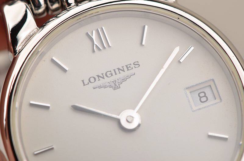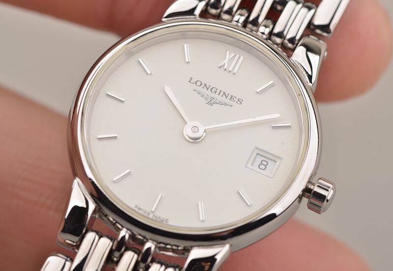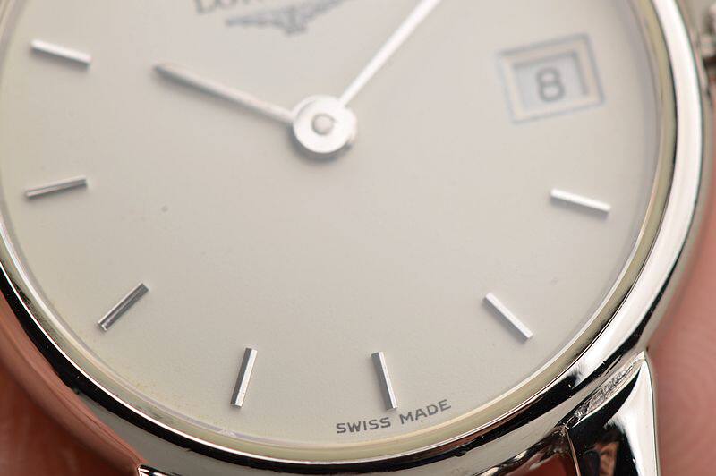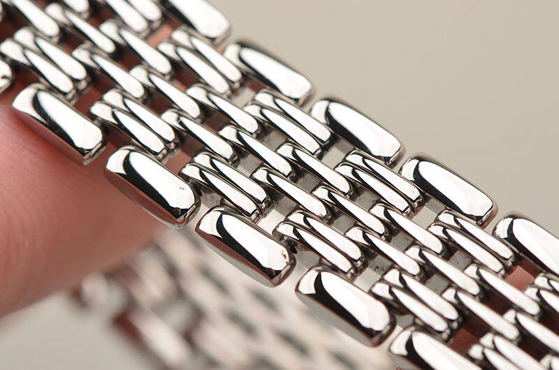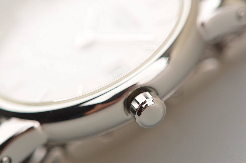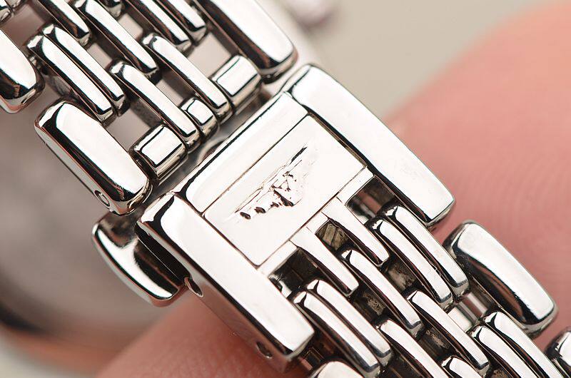 精钢表壳及链带,按压式折叠表扣。蓝宝石水晶镜面,立体白色表盘,3点位日历显示窗口。口径24MM*5.3MM,防水30M。