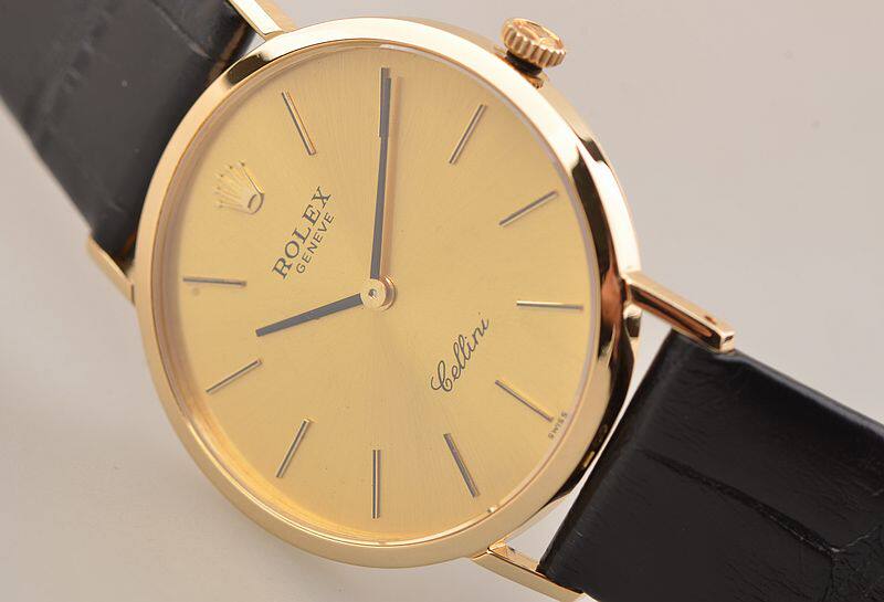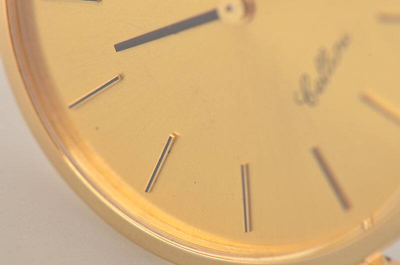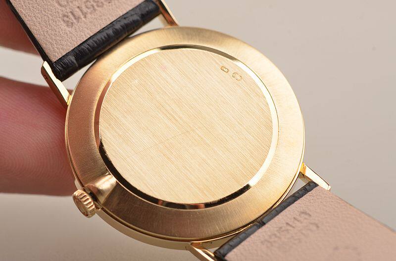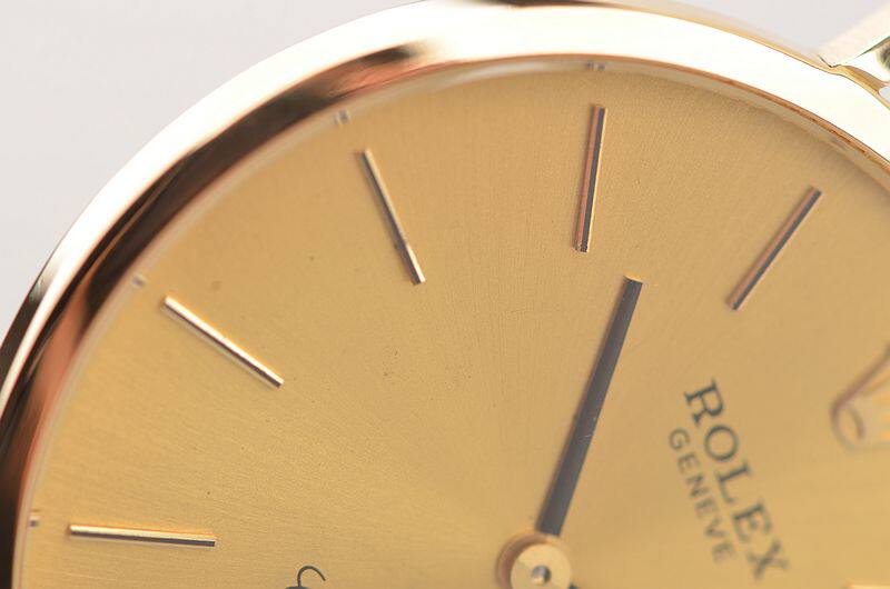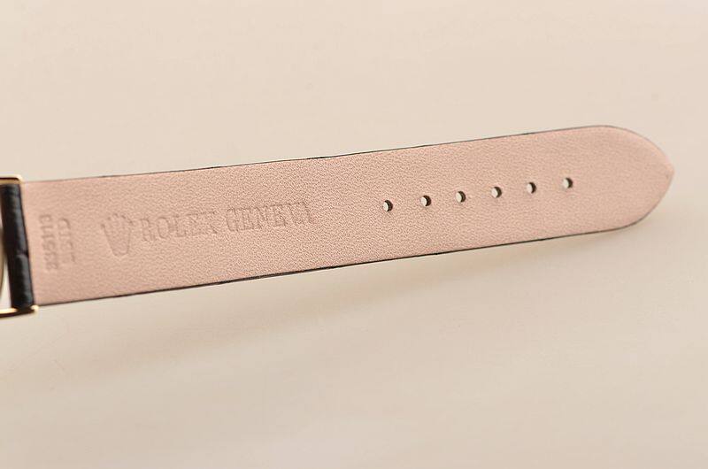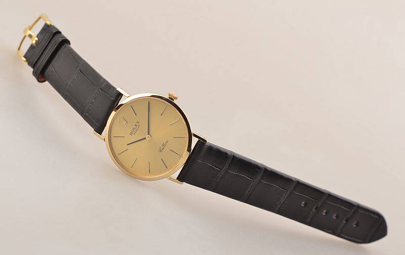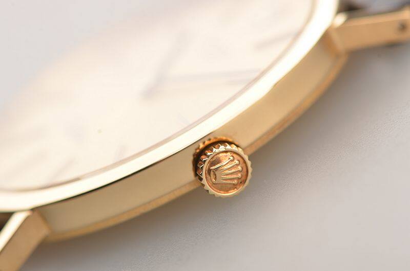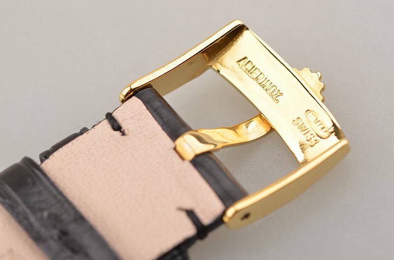 18K黄金表壳及表扣,女皇头印记。后配全新黑色鳄鱼皮表带。蓝宝石水晶镜面,立体金色表盘,金质时标,镀铑指针。口径32MM*6MM。防水30M。