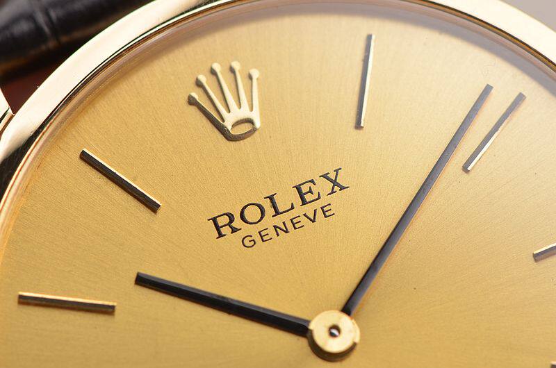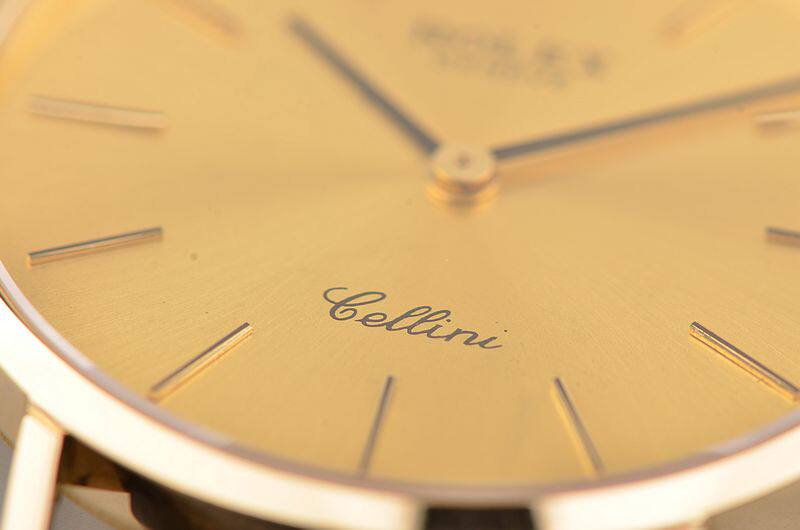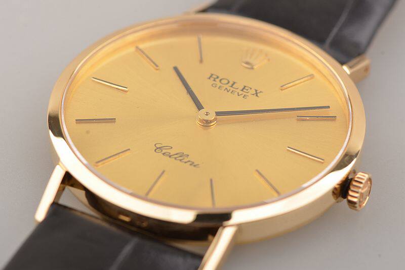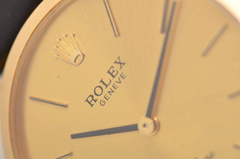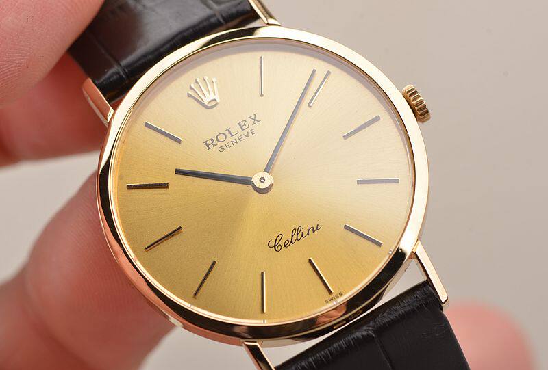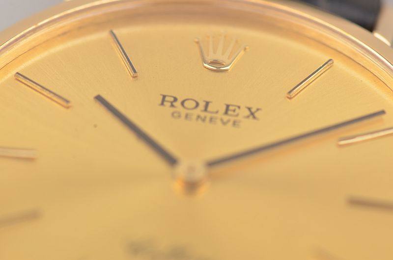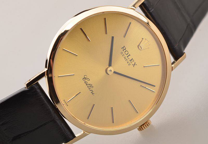 18K黄金表壳及表扣,女皇头印记。后配全新黑色鳄鱼皮表带。蓝宝石水晶镜面,立体金色表盘,金质时标,镀铑指针。口径32MM*6MM。防水30M。