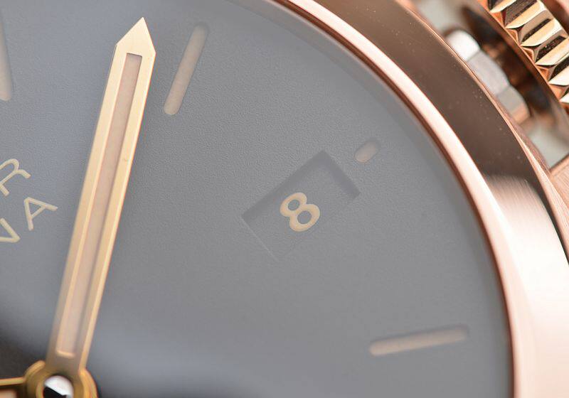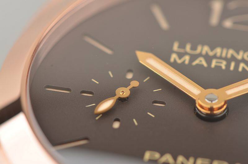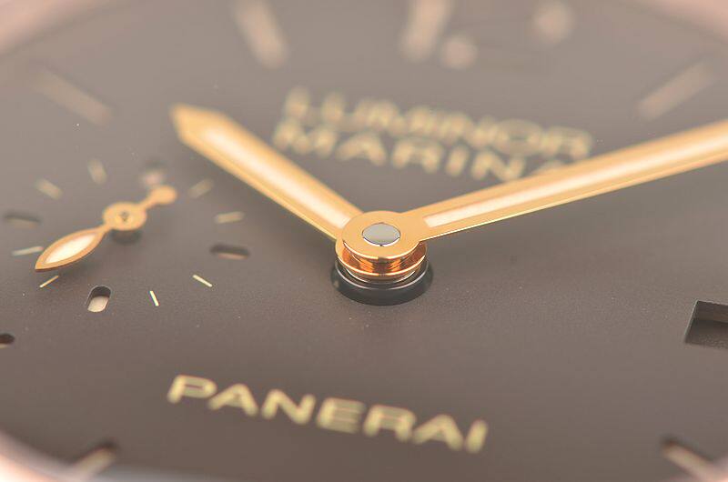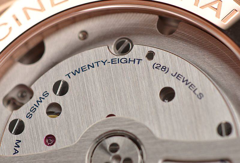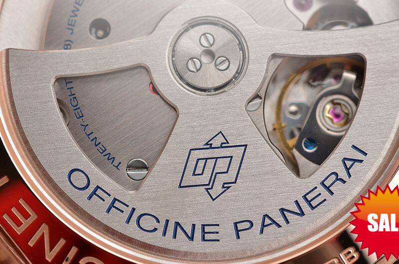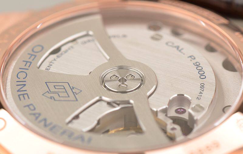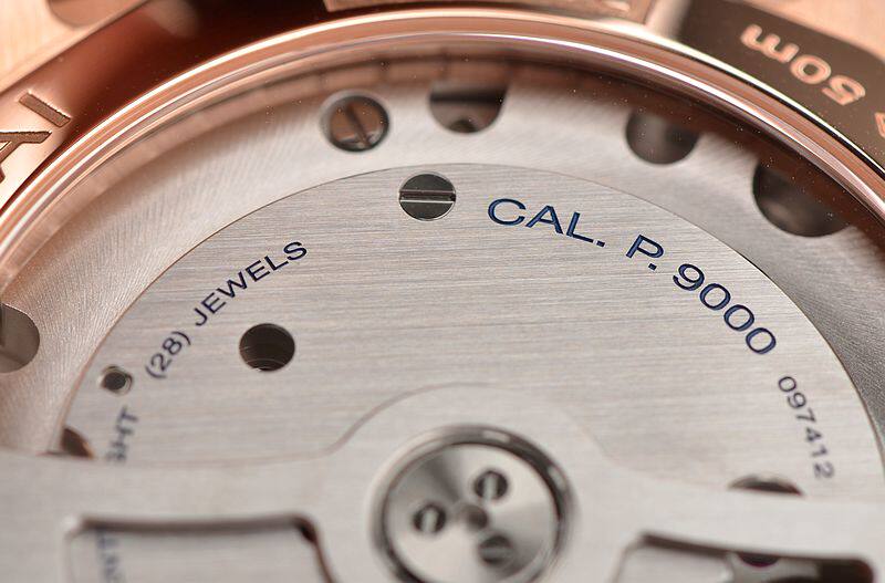 沛纳海自产CAL.P.9000型机芯,自动机械,极其精致日内瓦条纹打磨,倒角抛光修饰。由197个零件组成,双发条盒,28钻,摆频28800,Incabloc®防震裝置,Glucydur®平衡擺輪,动力储存约72小时。走时状态极嘉。