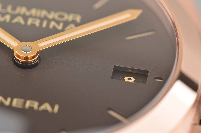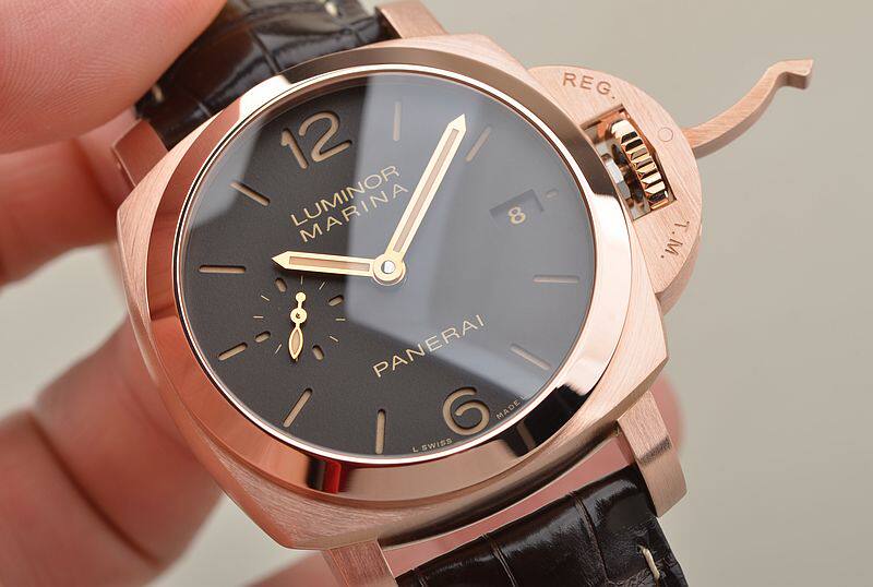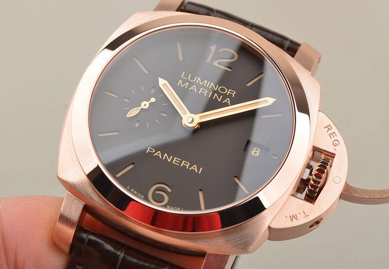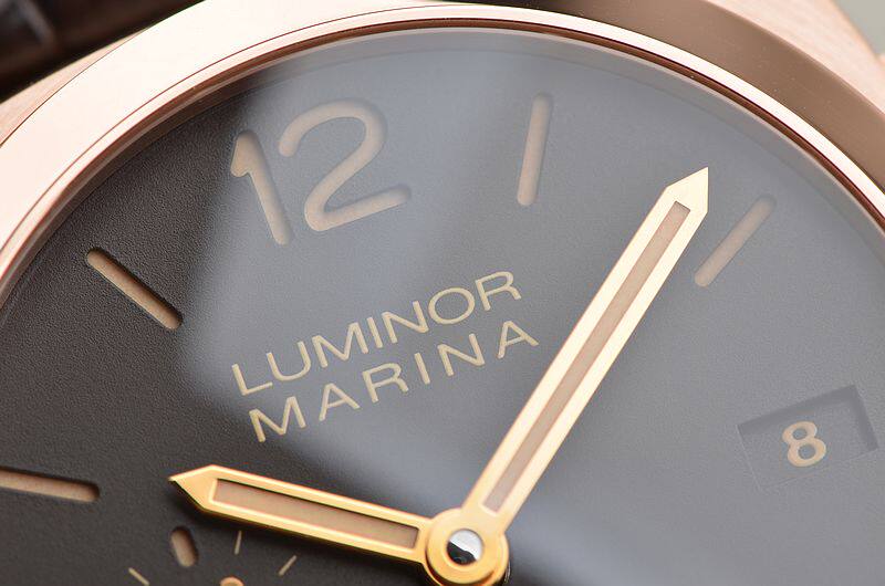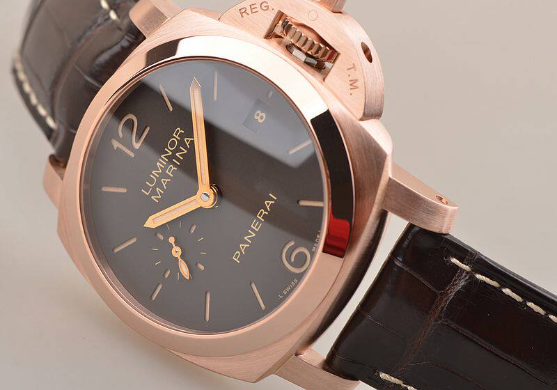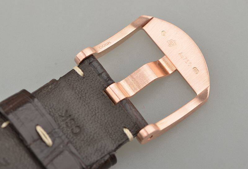 18K玫瑰金表壳及表扣,圣伯纳狗头印记。原厂棕色鳄鱼皮表带近全新成色。蓝宝石水晶镜面及底盖,立体棕色三明治夜光表盘,9点位独立小秒针,3点位日历显示功能。表冠护桥装置。口径42MM*15.8MM。防水50M。
