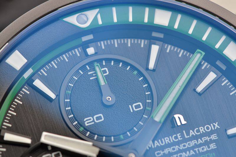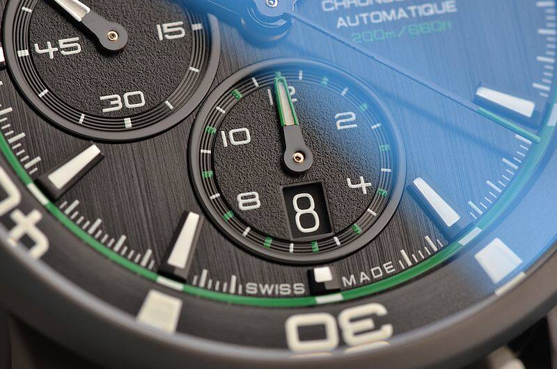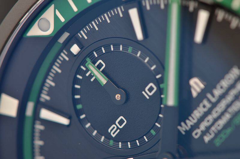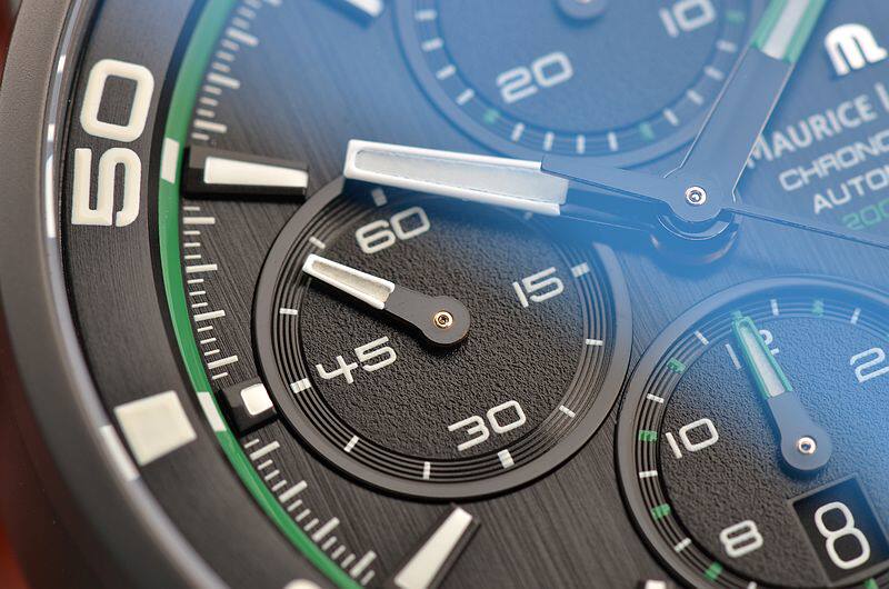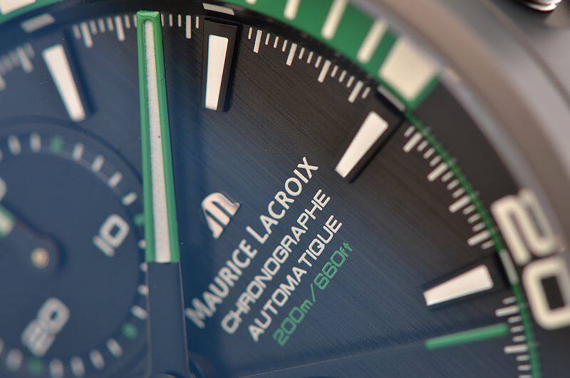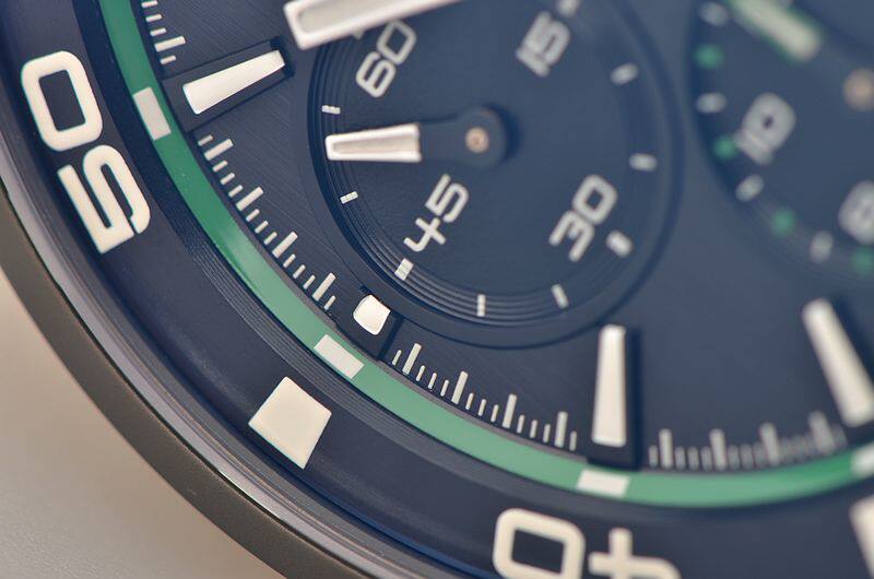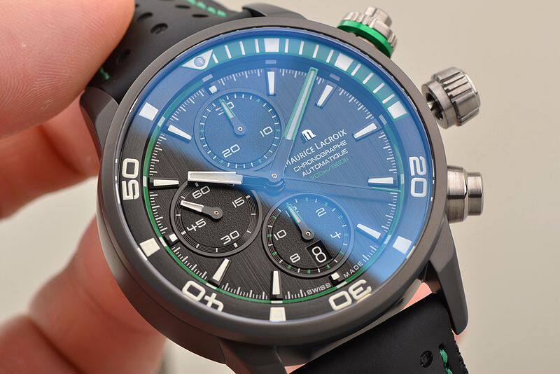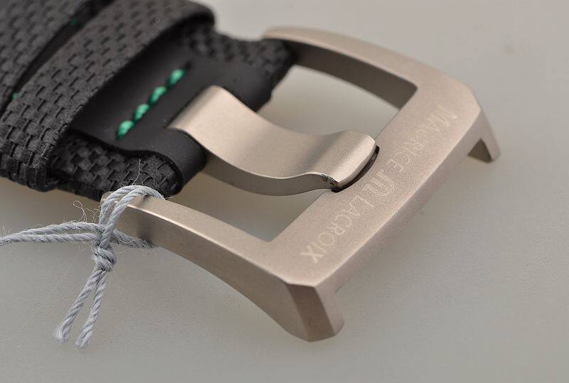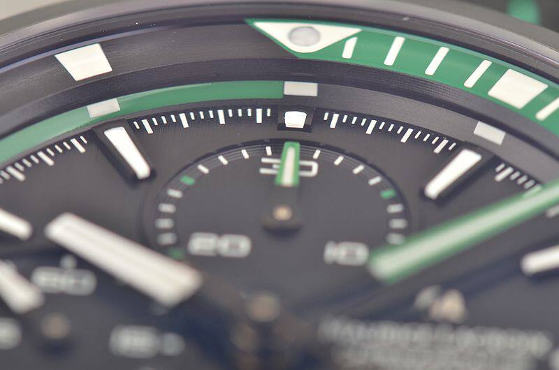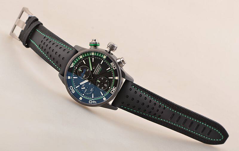 黑色Powerlite合金全喷砂表壳,钛金属表扣。抗反光涂层蓝宝石水晶镜面,黑色小牛皮与织物表带。黑色磨砂表盘,蜗形和喷砂处理的计数器,铑抛光计数器环和刻面指标,带有大SLN区域,清晰易读,黑色涂漆手钻石切割,多面发光涂层(除了第二手),与内旋转表圈和经过时间控制器表冠系统的秒针和分针颜色匹配。12点位30分钟计时,9点位独立小秒针,6点位12小时计时及日历显示功能。旋入式防水表冠。口径43MM*15.6MM。防水200M。