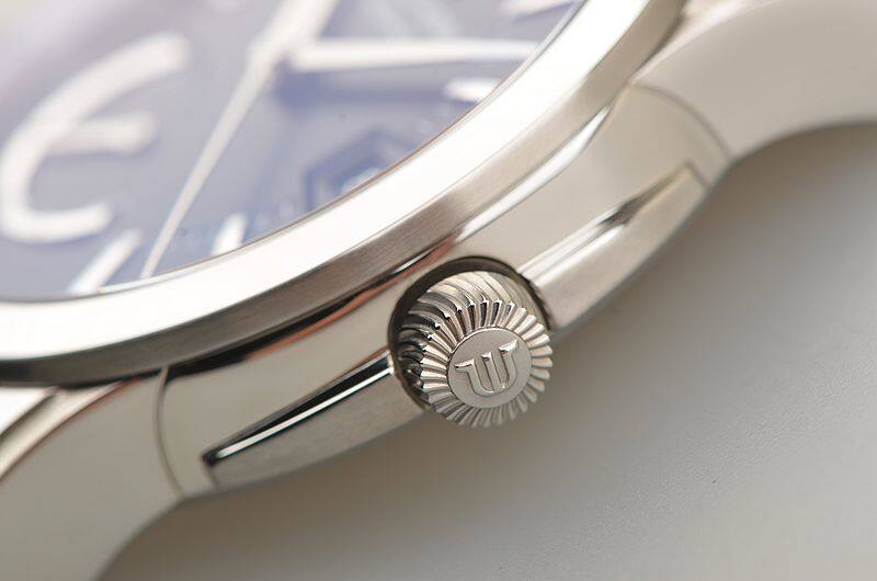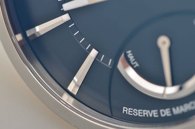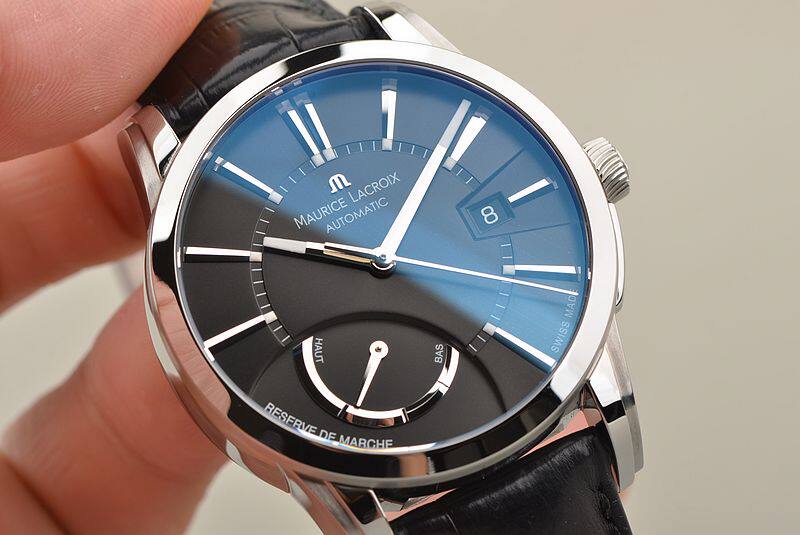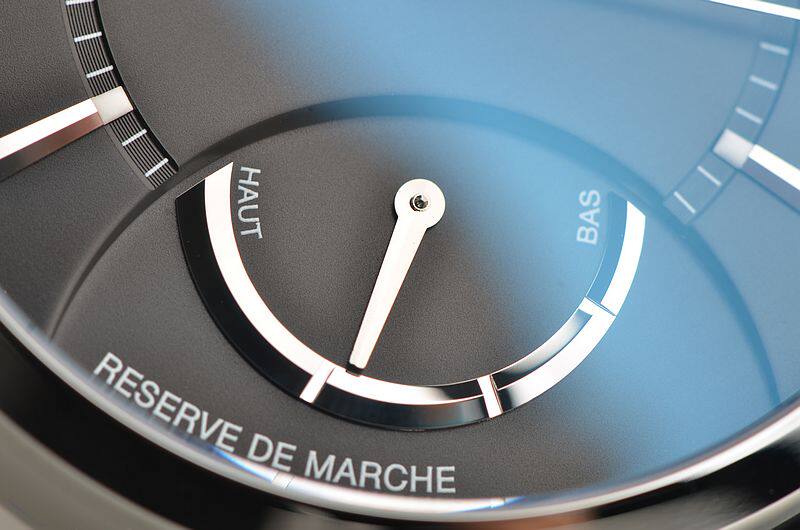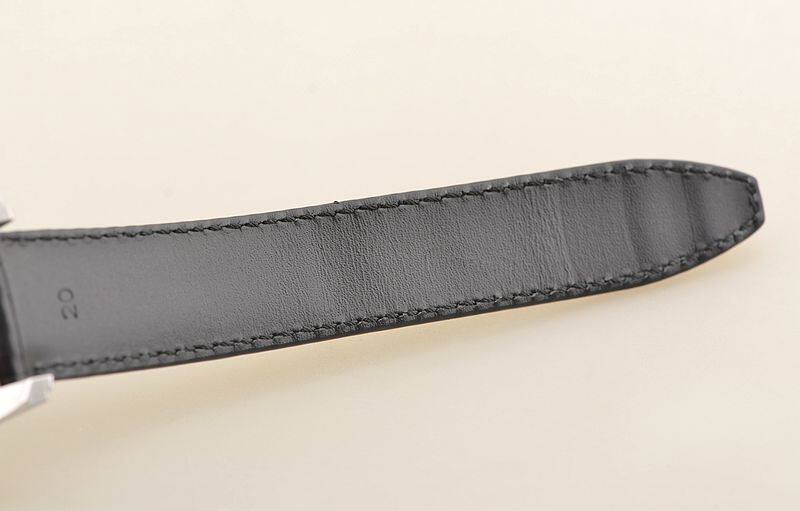 精钢表壳及按压式折叠表扣,黑色鳄鱼皮表带。抗反光涂层蓝宝石水晶镜面及底盖,立体黑色表盘,夜光刻度及时分针,3点位日历窗口,7点位指针式动力储备显示。口径40MM*12.6MM。防水50M。