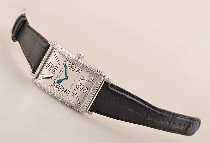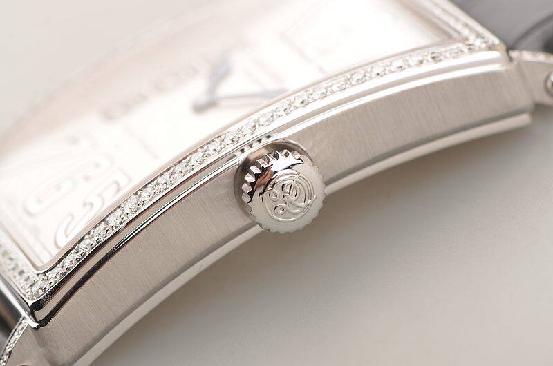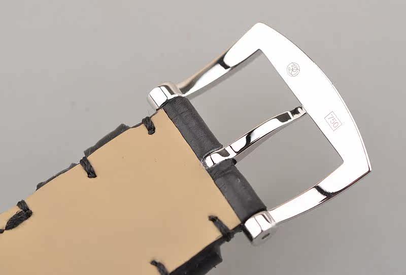 18K白金表壳及表扣,圣伯纳狗头印记。表壳及表耳后镶豪华天然美钻,全新后配黑色鳄鱼皮表带。蓝宝石水晶镜面及底盖,立体银灰色表盘,高亮阿拉伯数字刻度,桃心蓝钢指针,口径55.8MM*34MM*9.6MM。相当于圆表45MM左右大小。防水30M。
