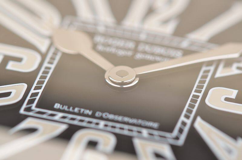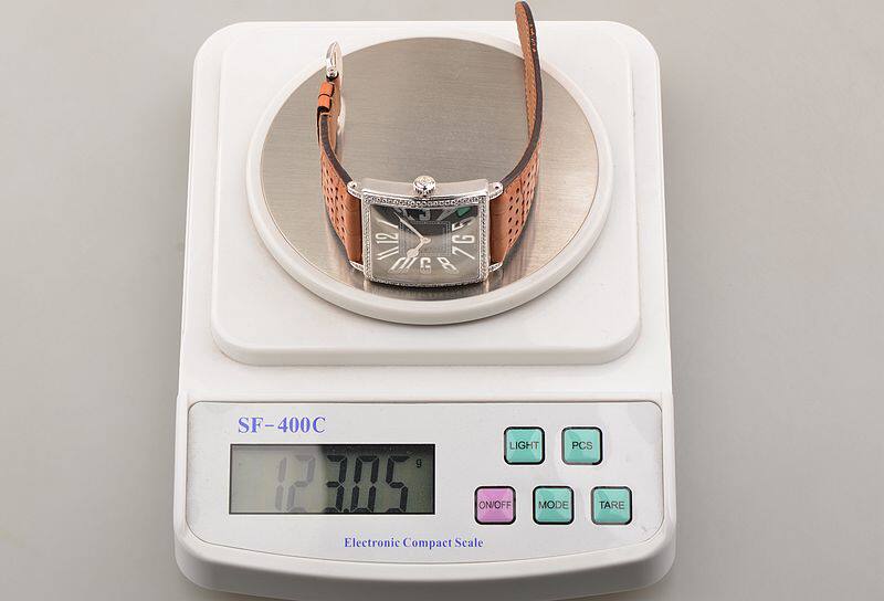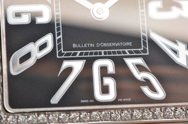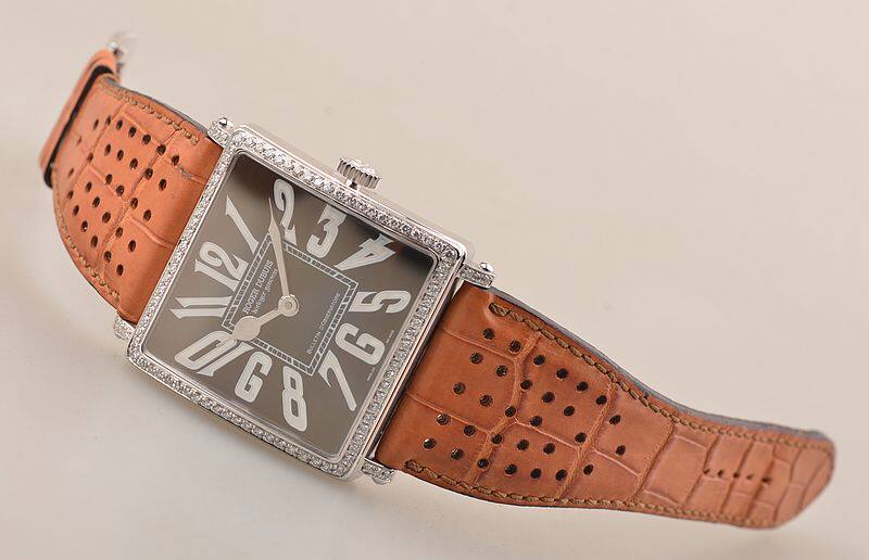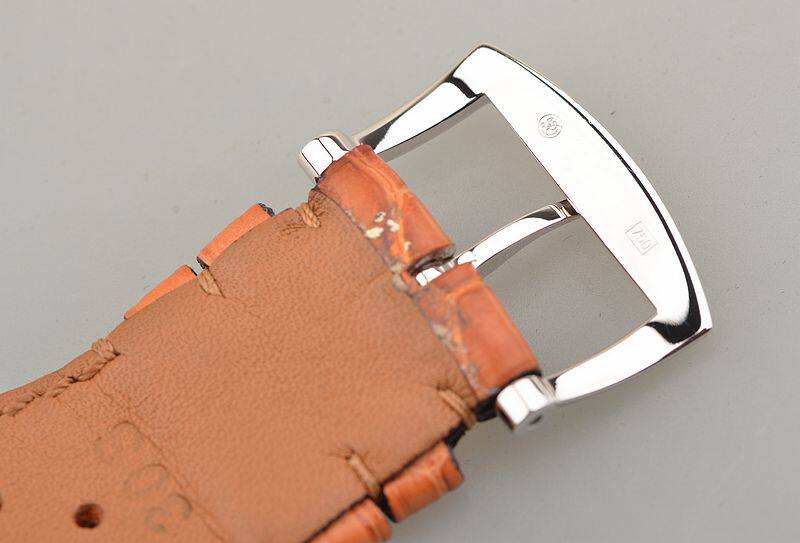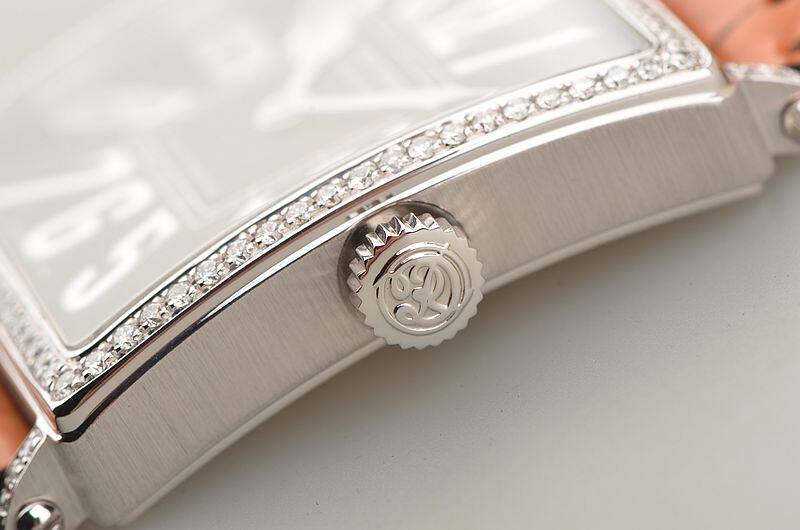 18K方形白金表壳及表扣,圣伯纳狗头印记。表壳及表耳后镶豪华天然美钻,原厂驼色鳄鱼皮表带成色很新。蓝宝石水晶镜面及底盖,立体黑色表盘,高亮阿拉伯数字刻度,桃心白金指针,口径48.7MM*40MM*9.6MM。相当于圆表45MM左右大小。防水30M。