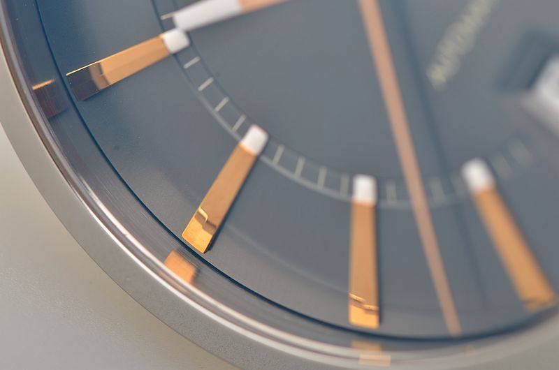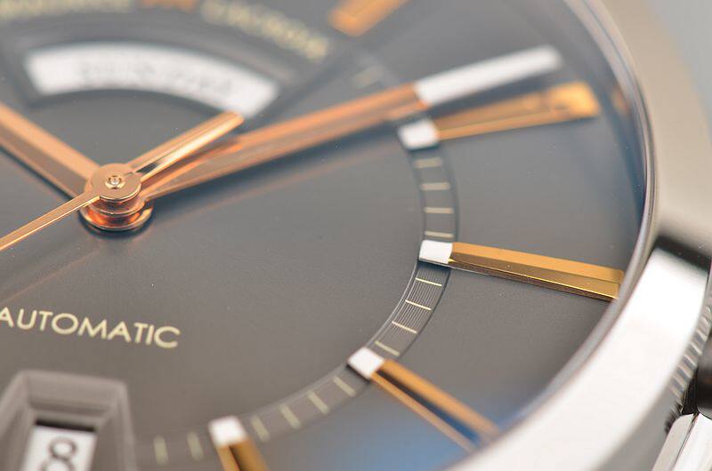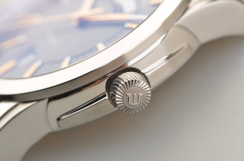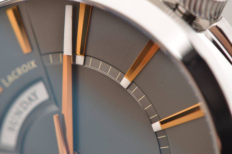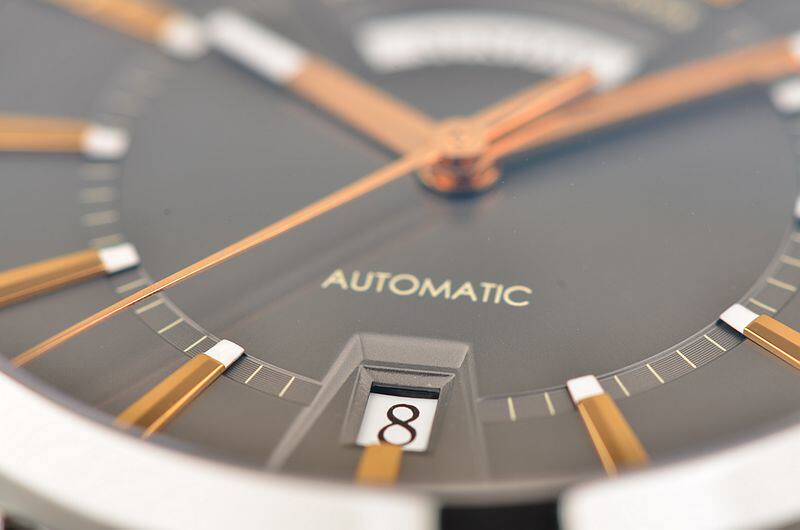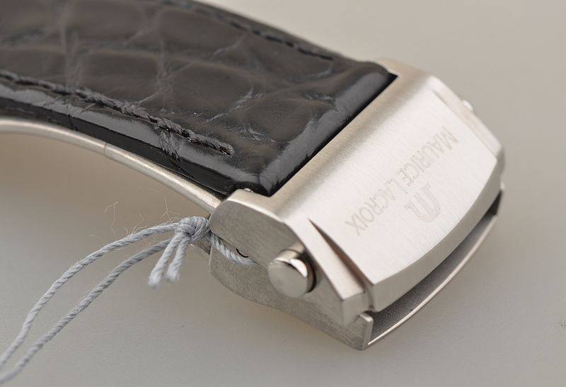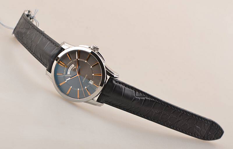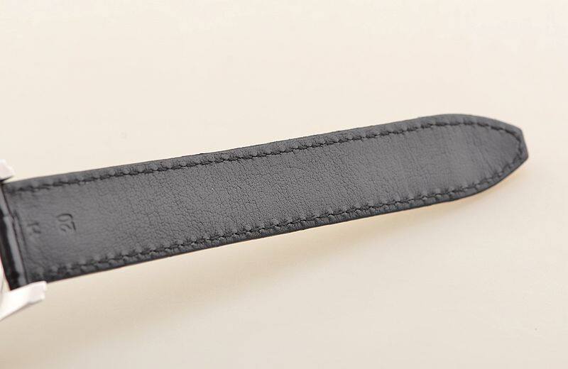精钢表壳及按压式折叠表扣,黑色鳄鱼皮表带。抗反光涂层蓝宝石水晶镜面及底盖,立体深灰色表盘,夜光刻度及时分针,12点位星期视窗,6点位日历显示。口径40MM*12.4MM。防水50M。