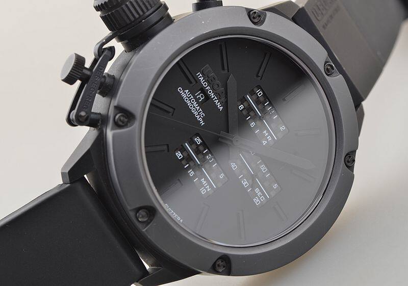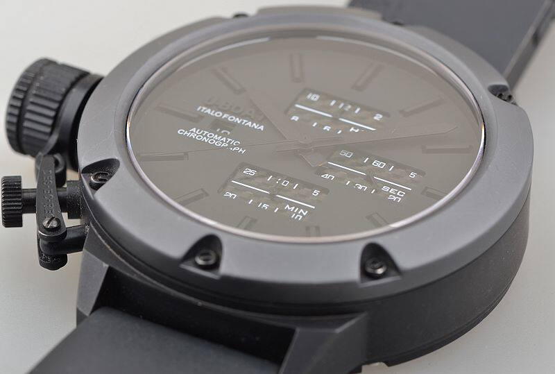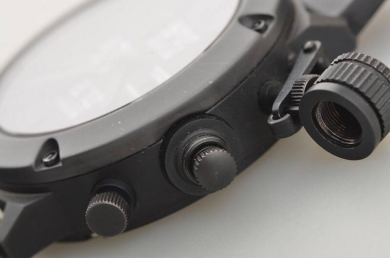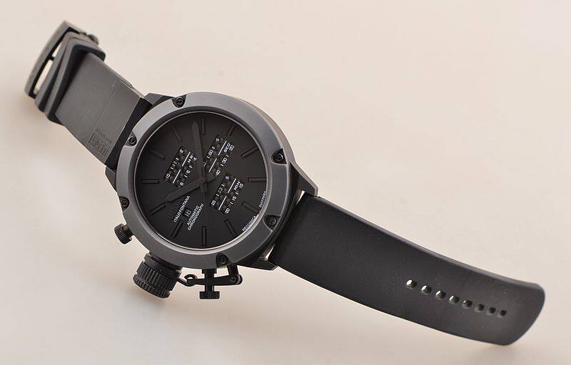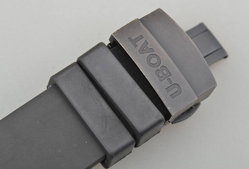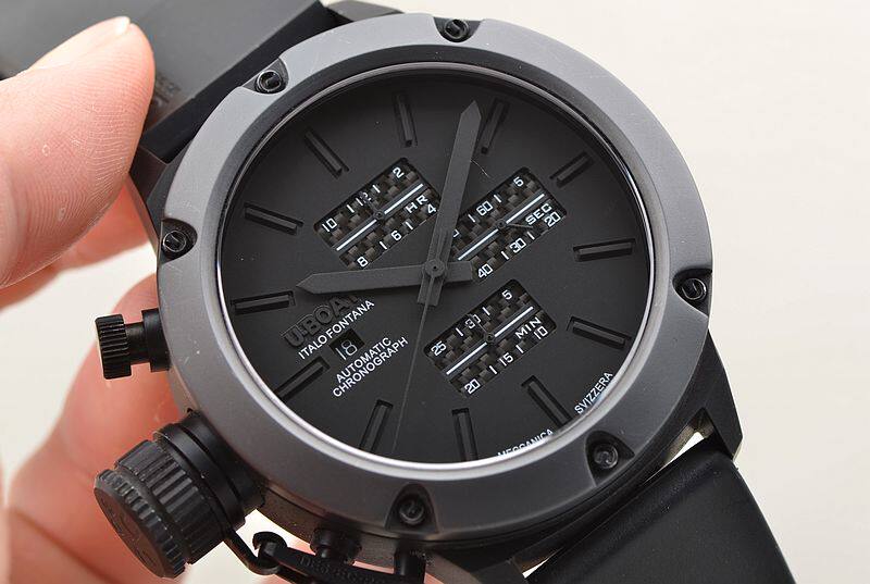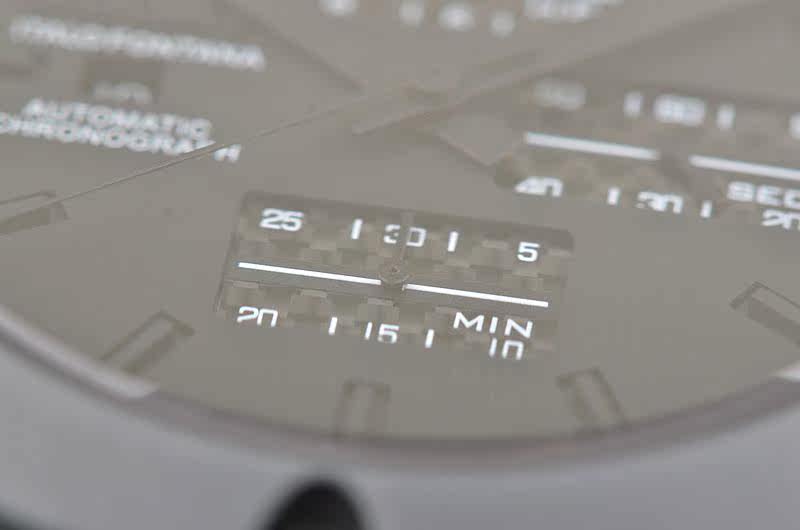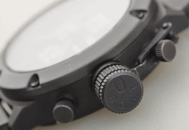 IPB黑钢表壳及折叠式表扣,钛合金表圈,左撇子设计,附有表冠保护装置。原厂黑色橡胶表带成色极新。蓝宝石水晶镜面及底盖小窗。立体黑底搭配碳纤维计时表盘,9点位日历显示,12点位12小时计时,3点位独立小秒针,6点位30分钟计时,口径52MM*17.1MM不含表把,含表把62.5MM。腕表中的巨无霸,建议体重180斤以上表友才考虑。防水200M。