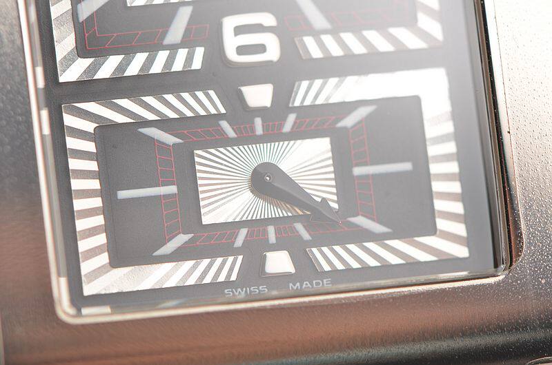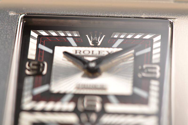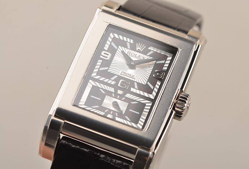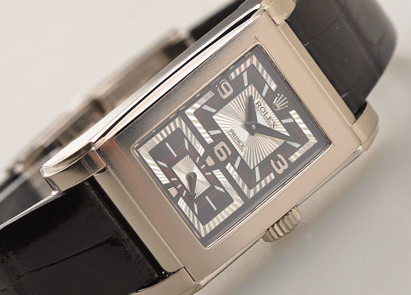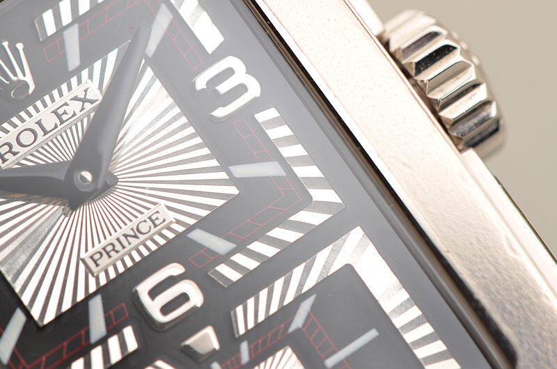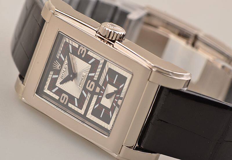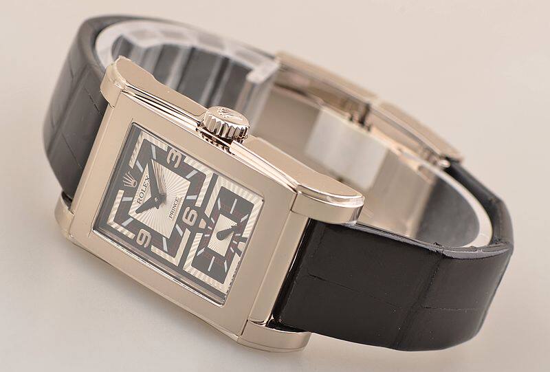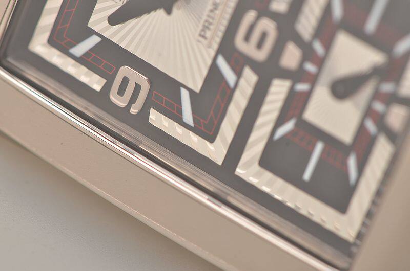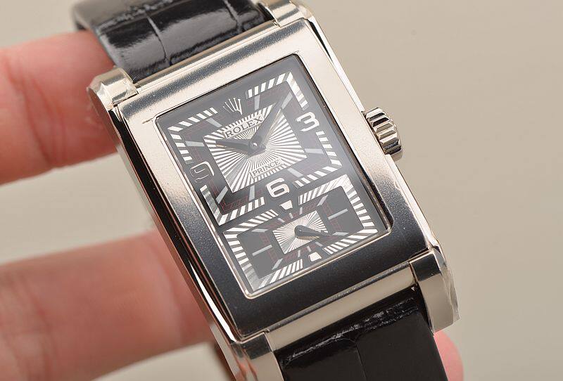18K白金表壳及折叠式表扣,圣伯纳狗头印记。黑色鳄鱼皮表带。蓝宝石水晶镜面及底盖,立体白金镀银双色雕刻表盘,小三针设计,夜光刻度,口径45MM*29MM*10MM。相当于圆表40MM左右大小。防水50M。