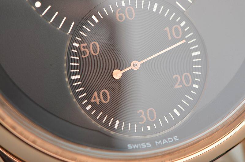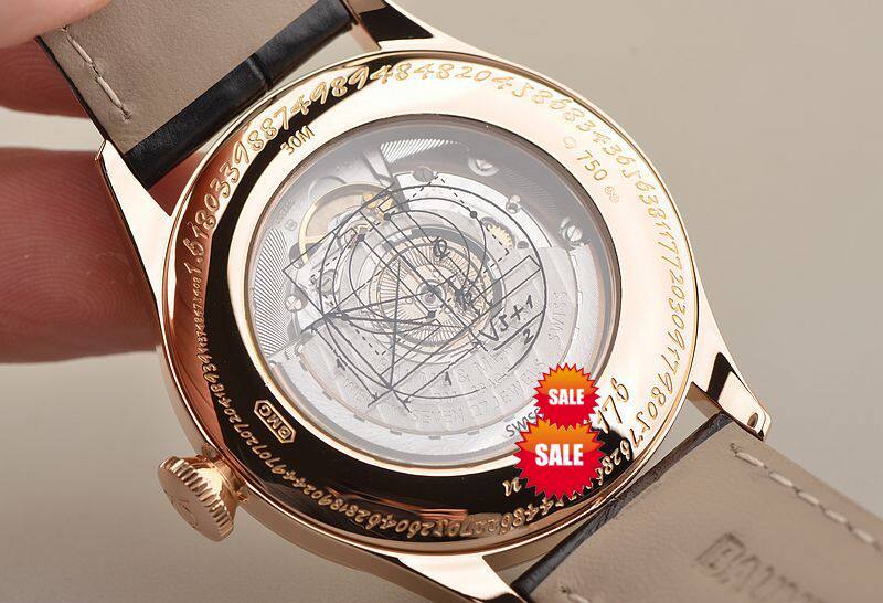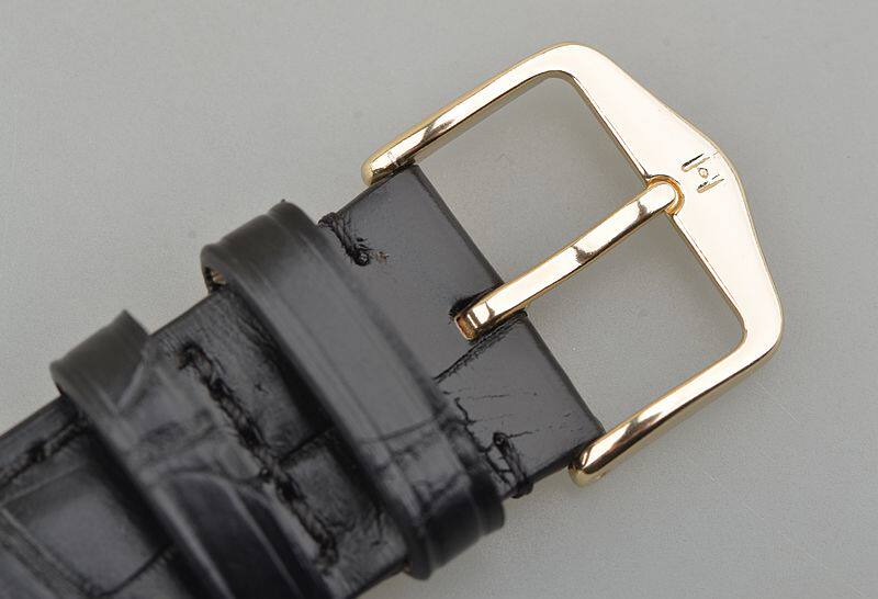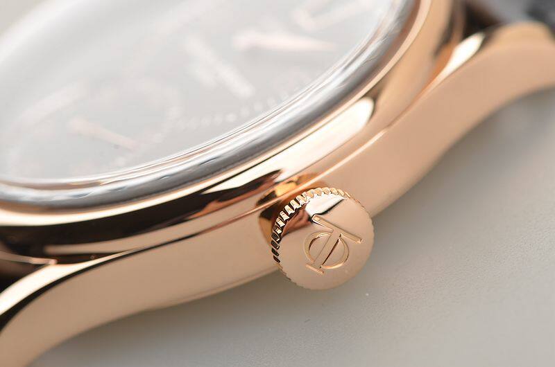 18K玫瑰金表壳及后配表扣(非原装扣),后配黑色鳄鱼皮表带。蓝宝石水晶镜面及底盖,立体黑色表盘,玫瑰金刻度及指针,6点位独立小秒针,跳时功能。口径39MM*11MM。防水30M。
