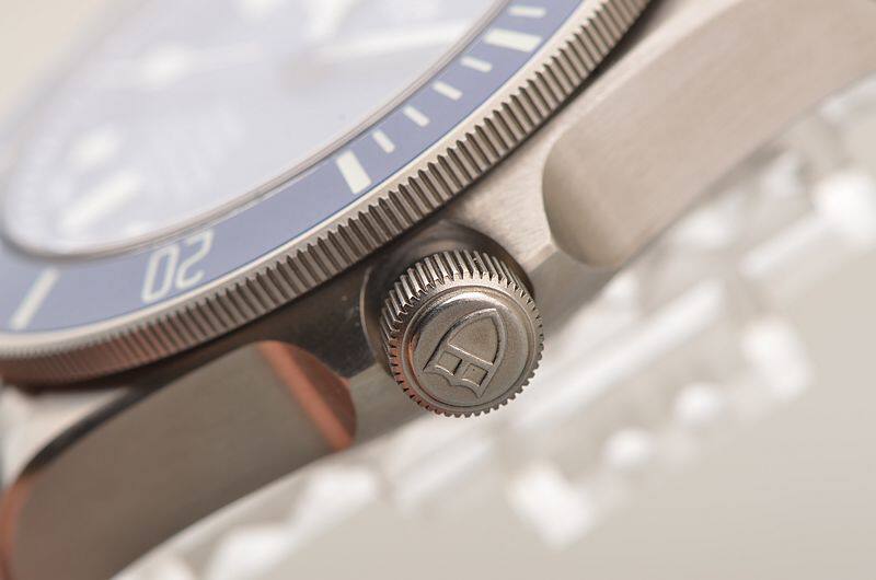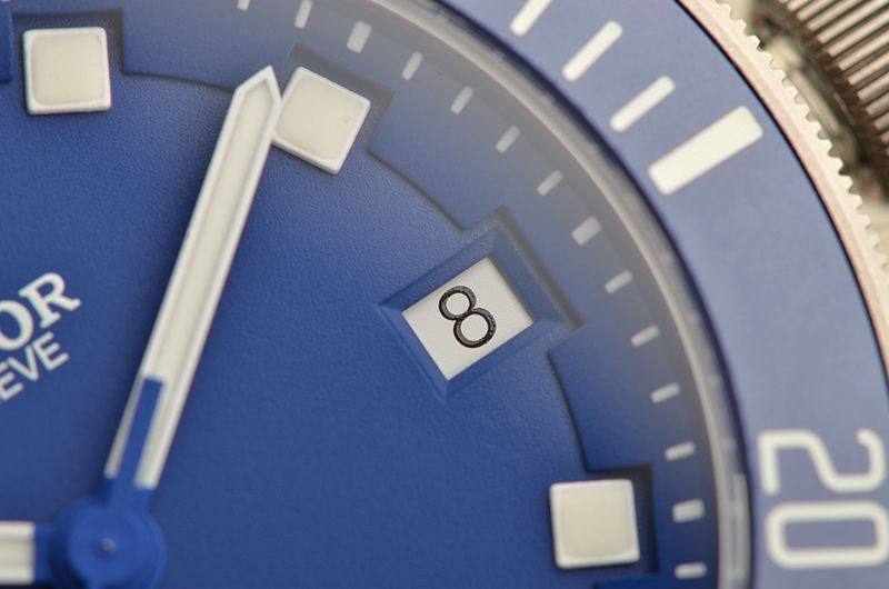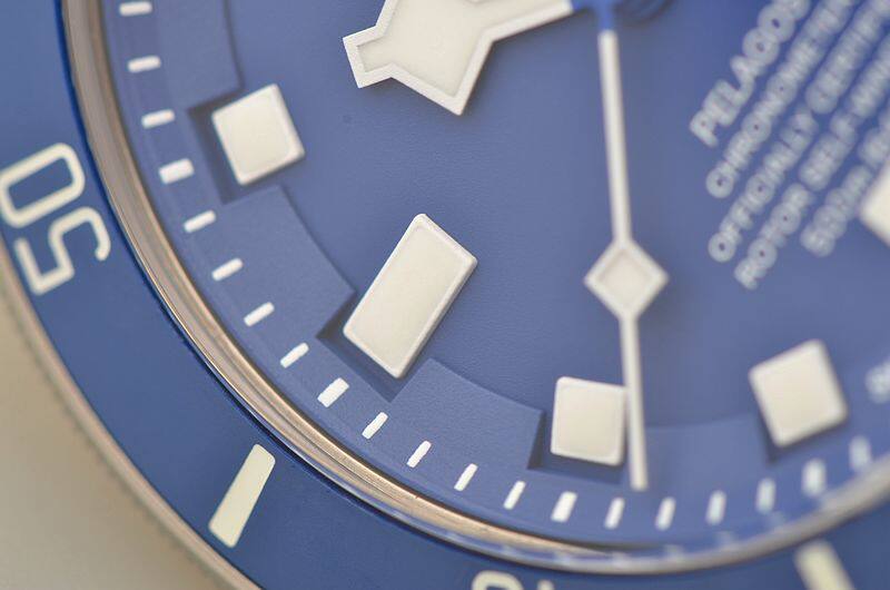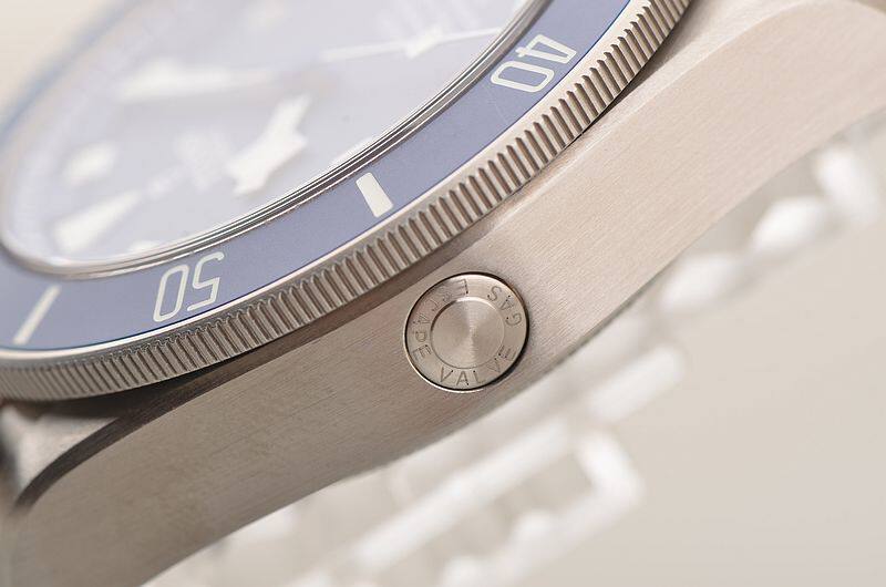 钛金属表壳及链带,专利可调节折叠表扣。蓝色哑光陶质计时字圈,蓝宝石水晶镜面,立体蓝色表盘,立体雪花夜光刻度及指针,又称“蓝斧头”。3点位日历显示功能。口径42MM*14.3MM。9点位配备排氦气门,旋入式防水锁把,专业潜水500M。