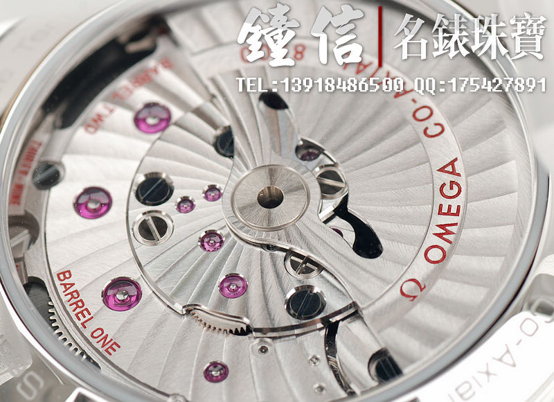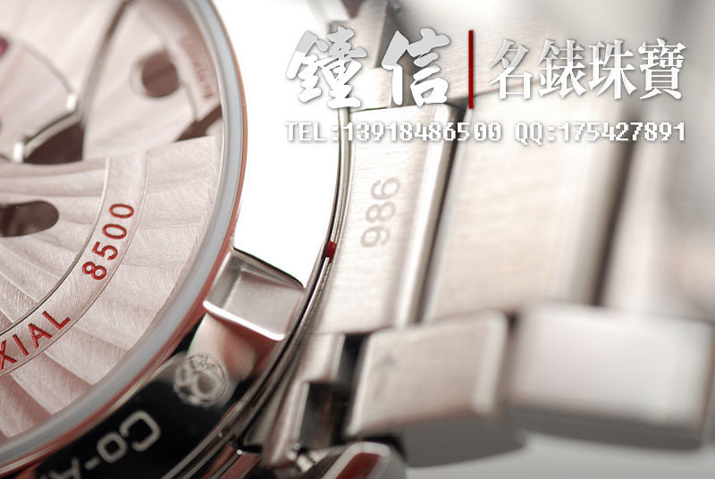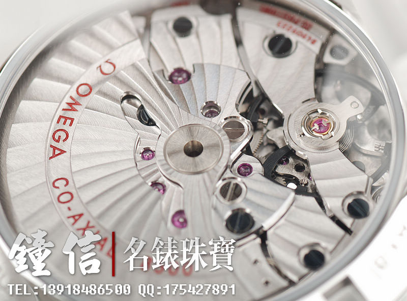 机 芯: 欧米茄8500备有同轴擒纵装置的自动上链机芯,确保稳定持久的精准计时。无卡度游丝摆轮,双滚筒,双向自动上链,减少上链时间。桥板及摆动组件有阿拉伯式日内瓦波纹装饰。动力储存:60小时动力储存