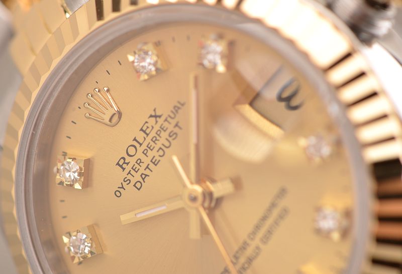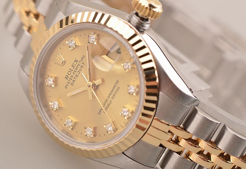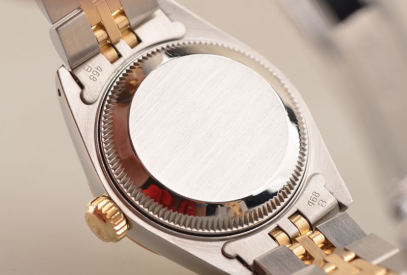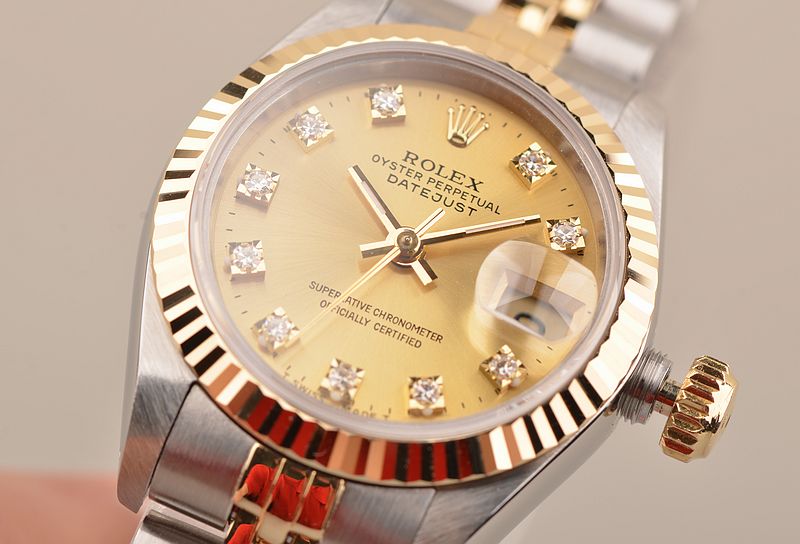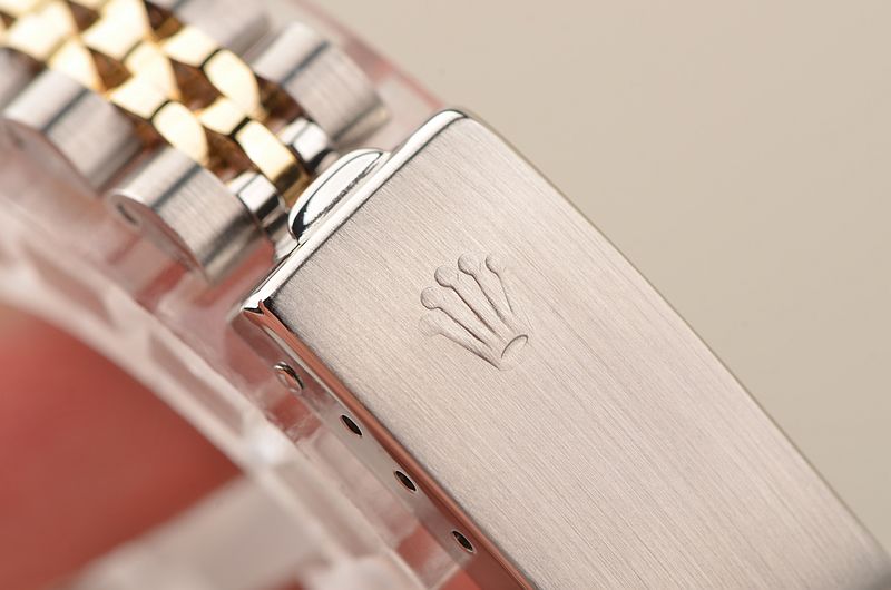 904L精钢及18K黄金表壳及链带,18K黄金三角坑纹表圈。折叠式表扣。蓝宝石水晶镜面,立体香槟金色表盘,原厂天然钻石刻度,黄金指针,3点位放大镜日历显示功能。旋入式防水表冠。口径26MM*11.8MM,防水100M。