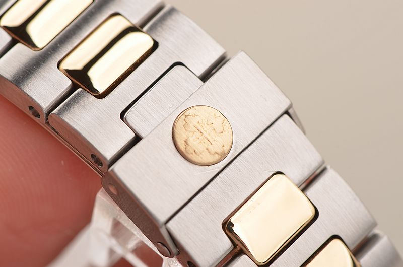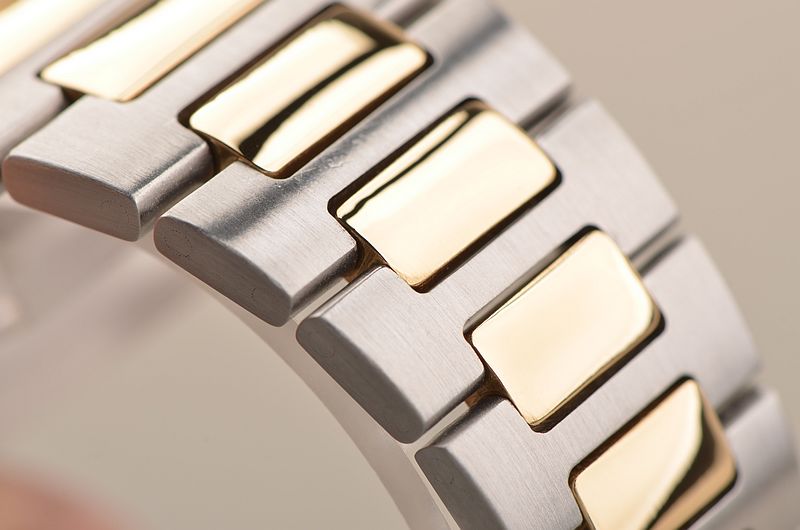 精钢及18K黄金表壳及链带,折叠式表扣。蓝宝石水晶镜面,立体香槟金色表盘,黄金夜光刻度及指针,日历显示功能。口径37.5MM*8MM,防水30M。
