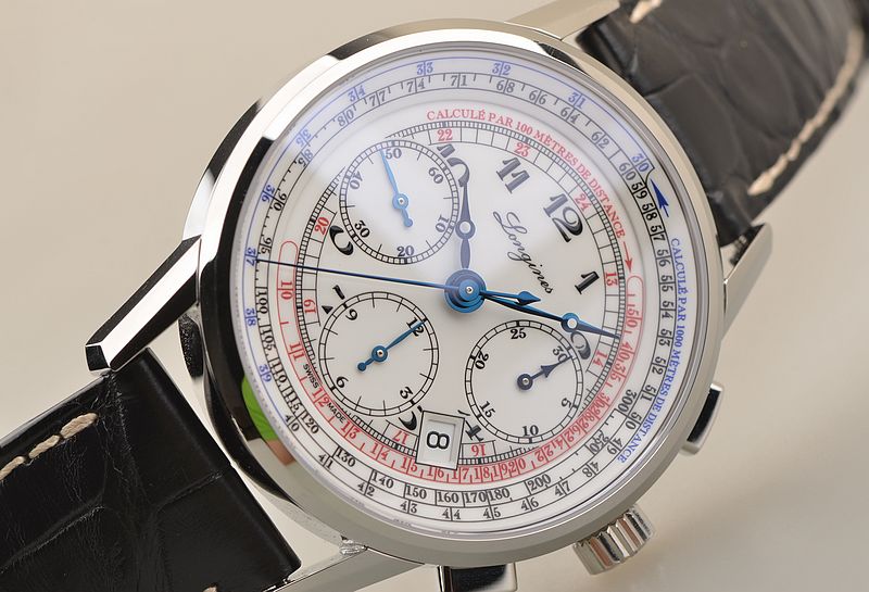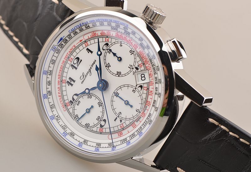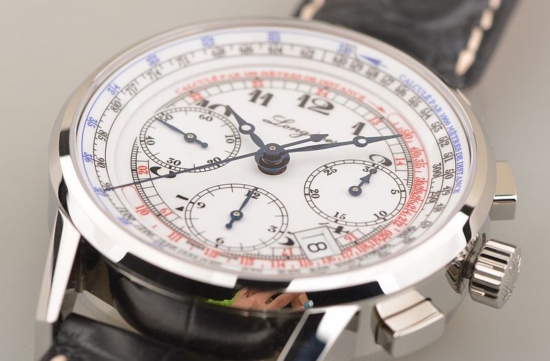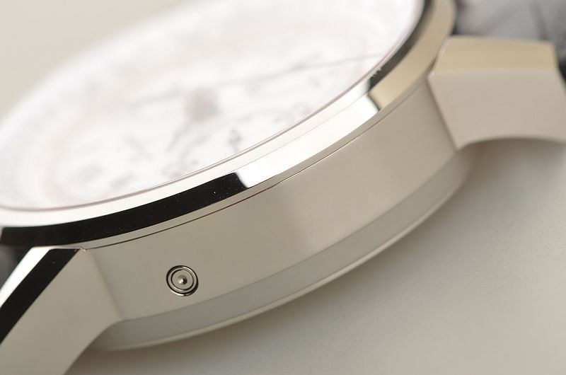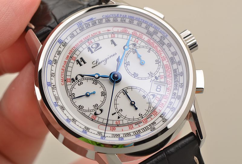 精钢表壳及表扣,原厂黑色鳄鱼皮表带成色极新。蓝宝石水晶镜面及底盖,立体白色漆面抛光计时表盘,蓝钢指针。表圈外圈30-300数字刻度为普通测速计,单位距离为1000米,内圈红色10-50数字刻度为专业测速计,单位距离为100米。表壳侧面10点位调校孔为日历快调。口径41MM*14.8MM。防水30M。