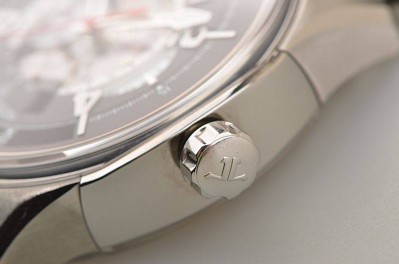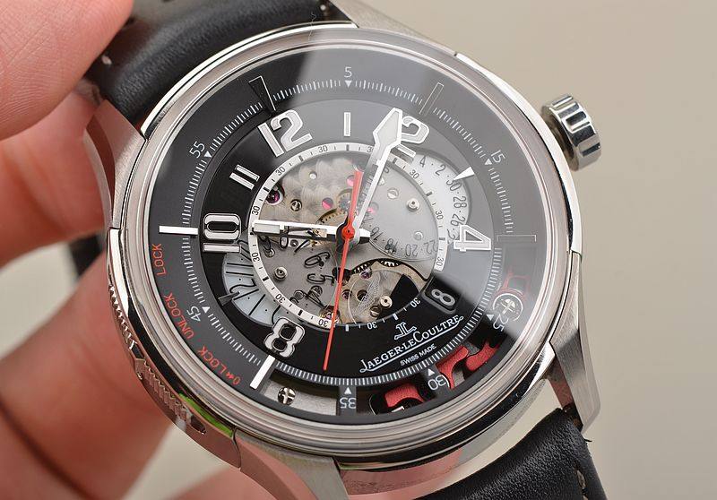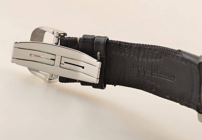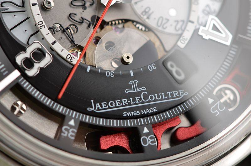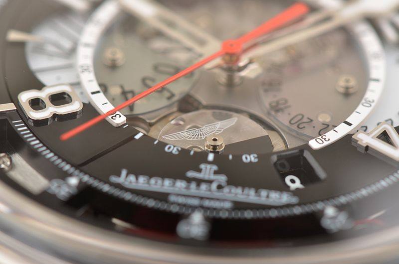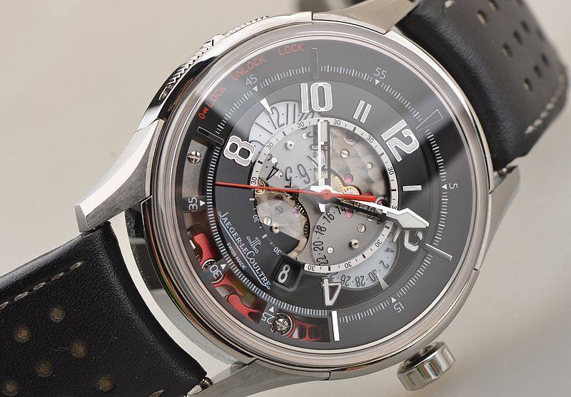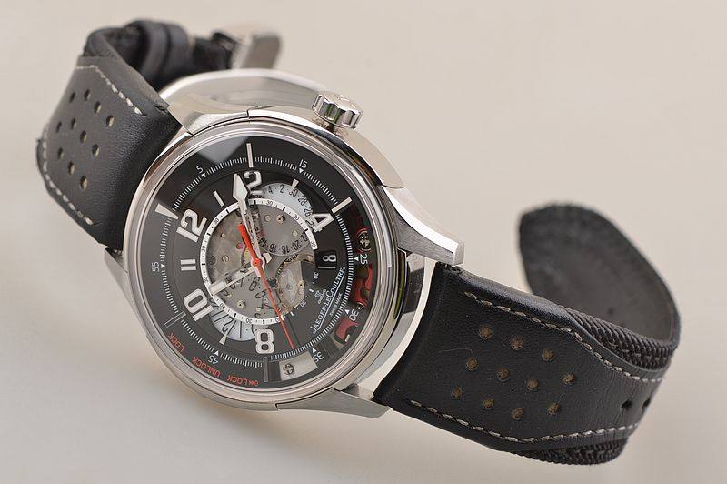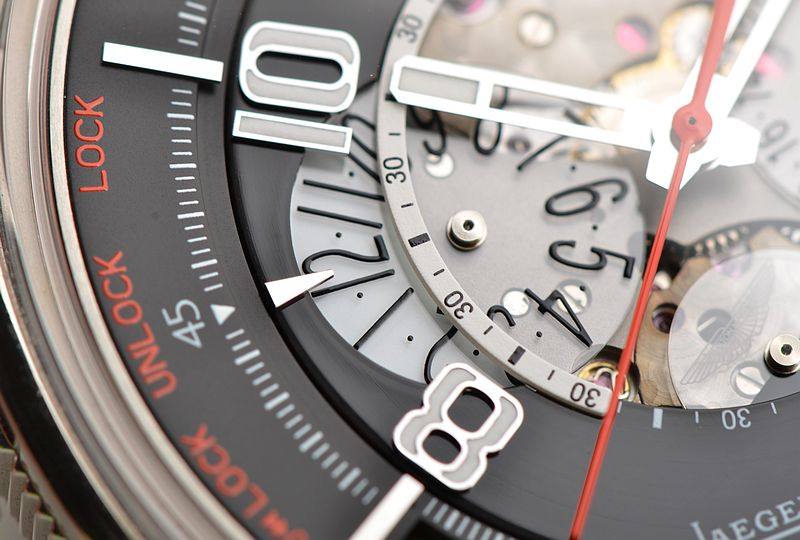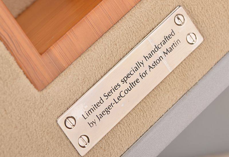 钛金属表壳及折叠式表扣,原厂黑色牛皮织物表带成色很新。蓝宝石水晶镜面及底盖,立体黑色镂空计时表盘,夜光刻度及指针,独特专利镜面按压式计时装置,9点位表壳侧面有锁止开关。红色计时长秒针,9点位12小时计时,6点位独立小秒针,3点位30分钟计时,口径44MM*14MM,防水50M。精美的阿斯顿马丁与积家厂牌镌刻底盖,附有限量编号。