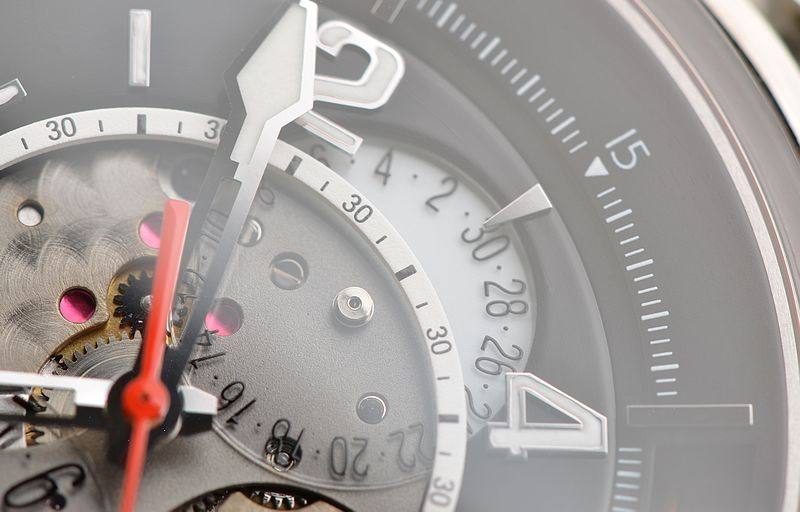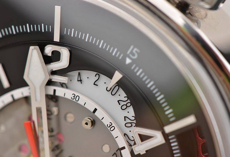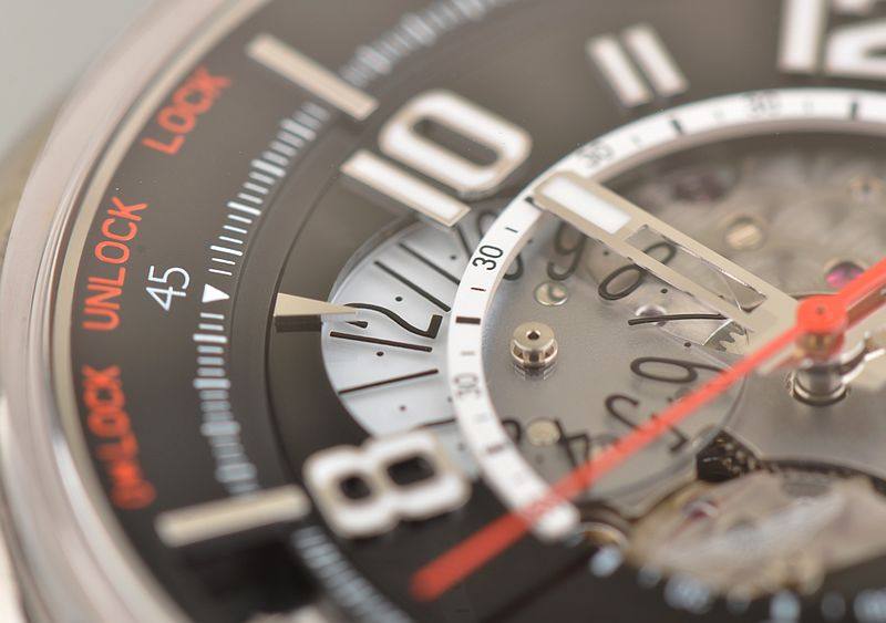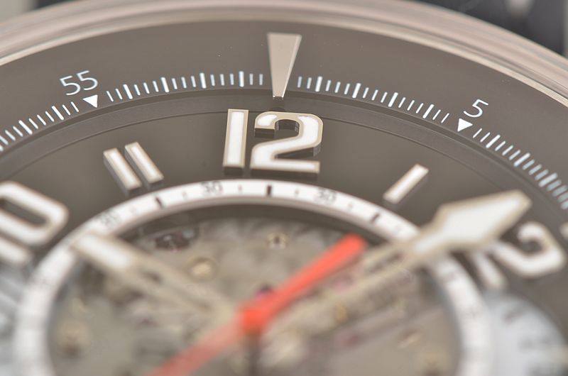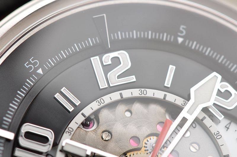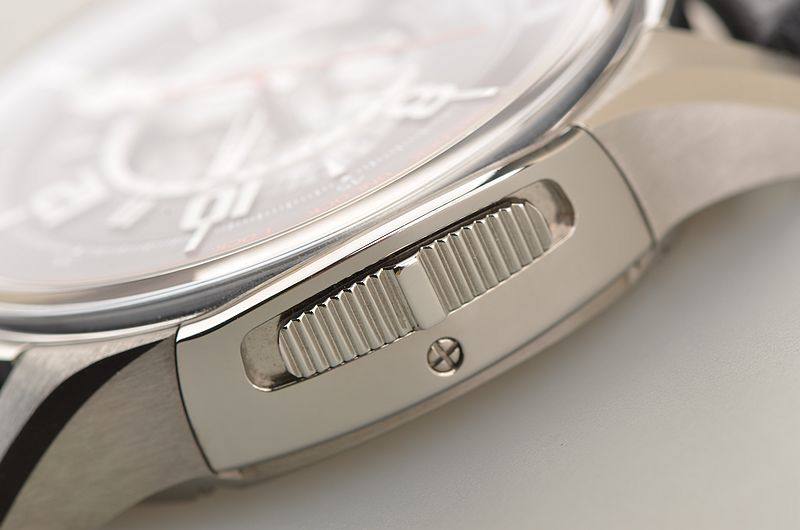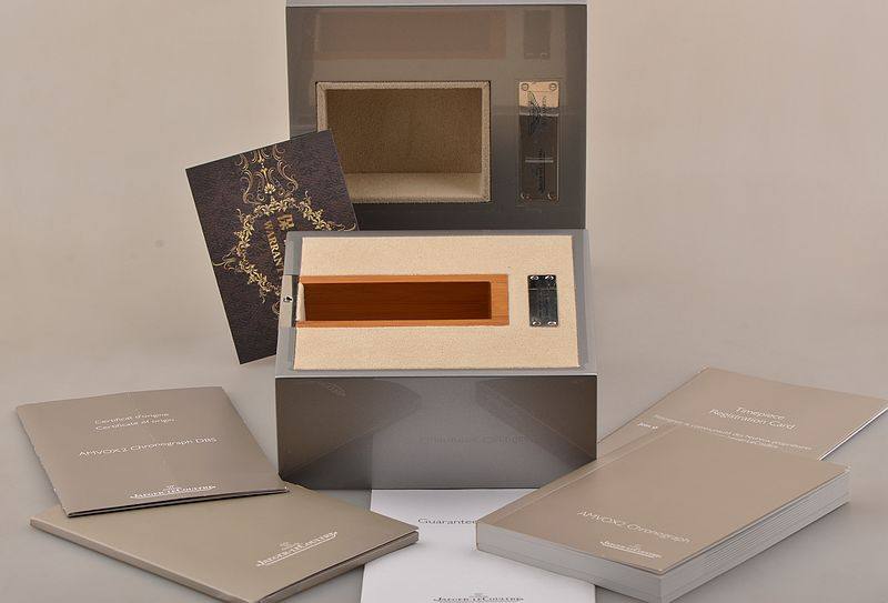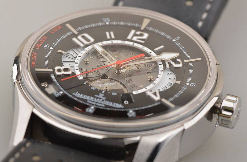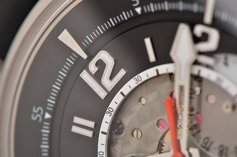 钛金属表壳及折叠式表扣,原厂黑色牛皮织物表带成色很新。蓝宝石水晶镜面及底盖,立体黑色镂空计时表盘,夜光刻度及指针,独特专利镜面按压式计时装置,9点位表壳侧面有锁止开关。红色计时长秒针,9点位12小时计时,6点位独立小秒针,3点位30分钟计时,口径44MM*14MM,防水50M。精美的阿斯顿马丁与积家厂牌镌刻底盖,附有限量编号。