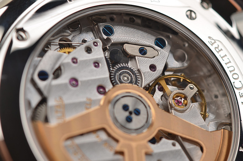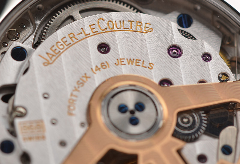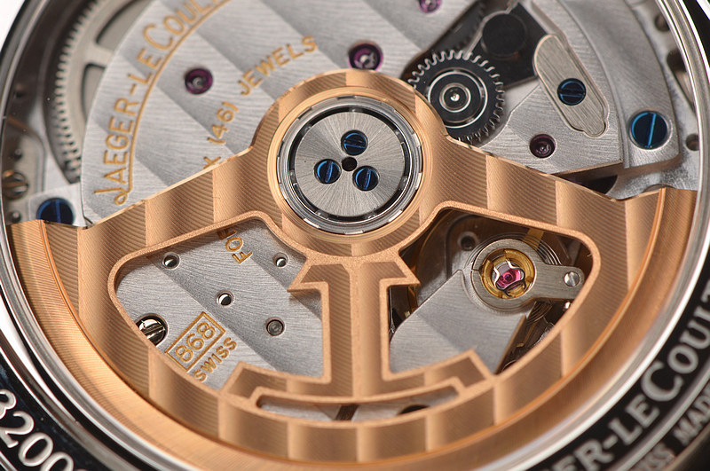 积家自产CAL.868/1型机芯,自动机械,万年历,动显,月相功能。极其精致日内瓦条纹打磨,倒角抛光修饰。由336个零件组成,46钻,摆频28800,18K玫瑰金镌刻LOGO自动转陀,动力储存约38小时。走时状态极嘉。