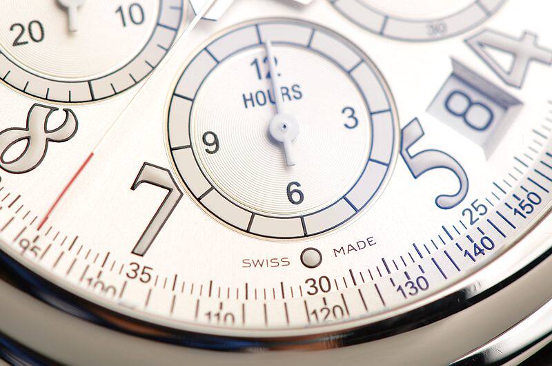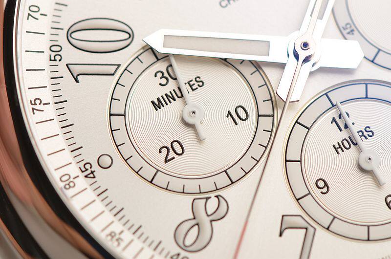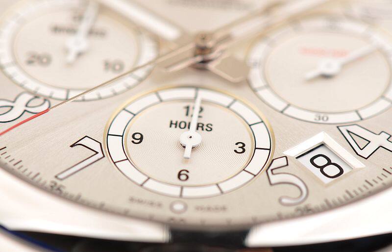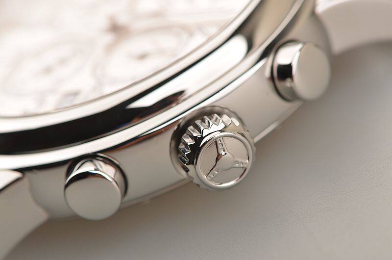 精钢表壳及表扣,后配全新黑色鳄鱼皮表带。蓝宝石水晶镜面及底盖,立体银白色计时表盘,夜光刻度及指针,9点位30分钟计时,6点位12小时计时,3点位独立小秒针,4点位日历显示。口径42MM*12.3MM,防水50M。