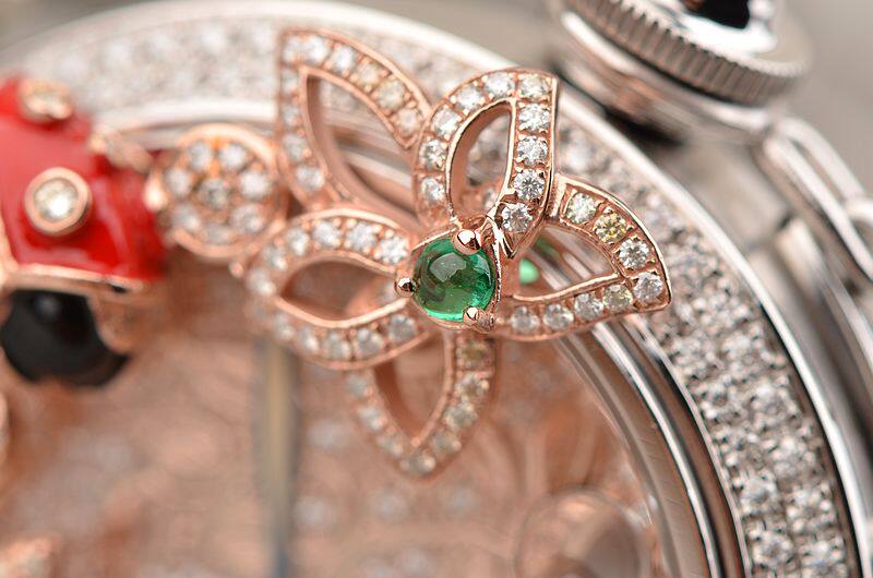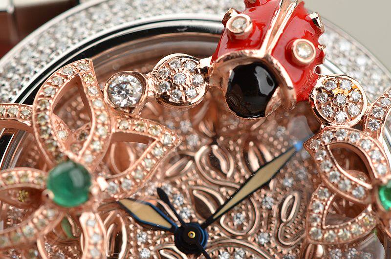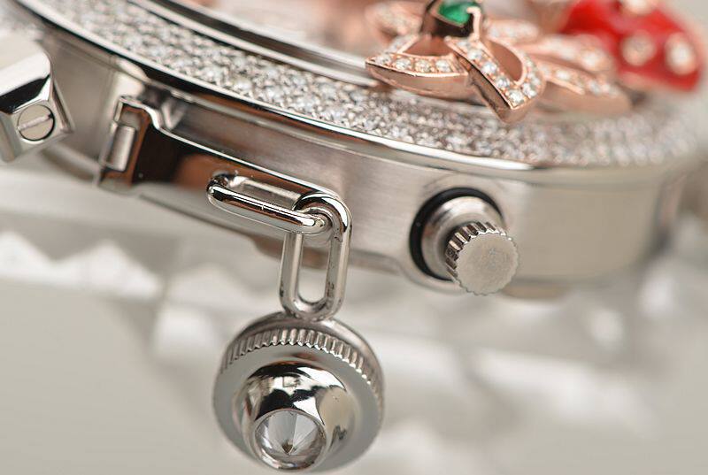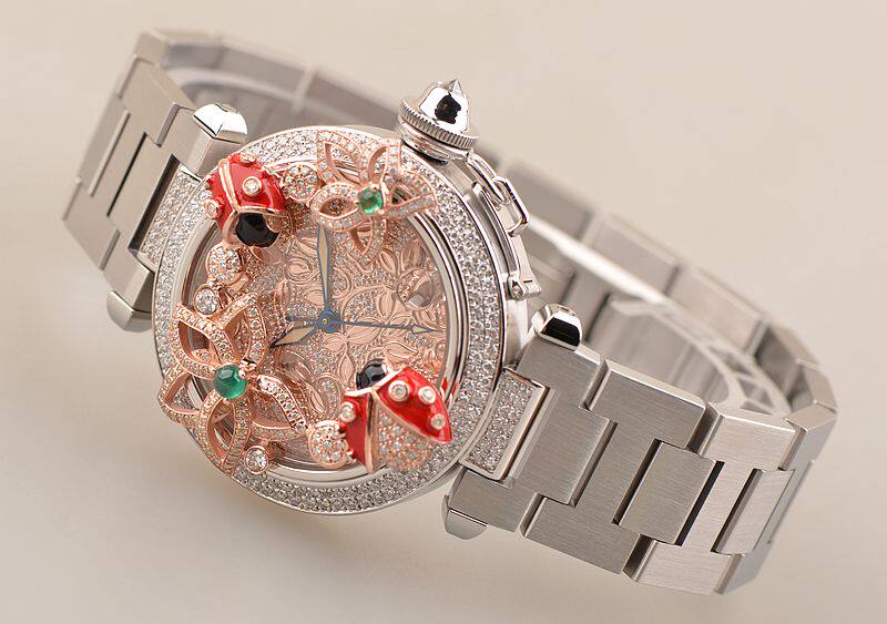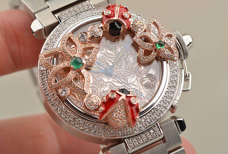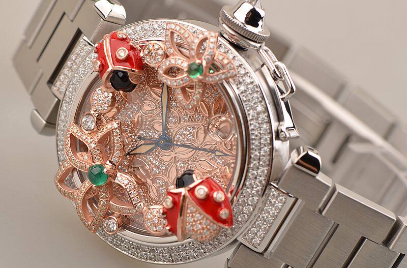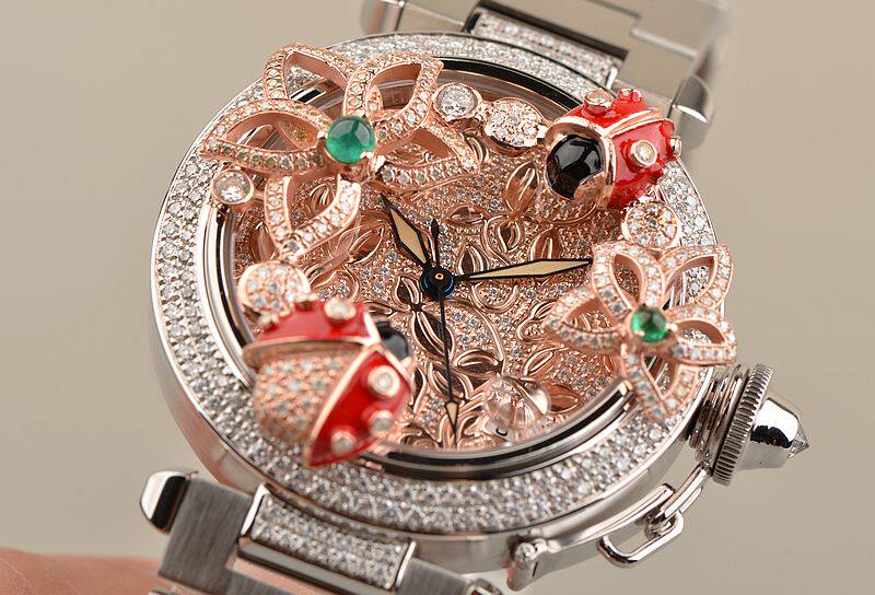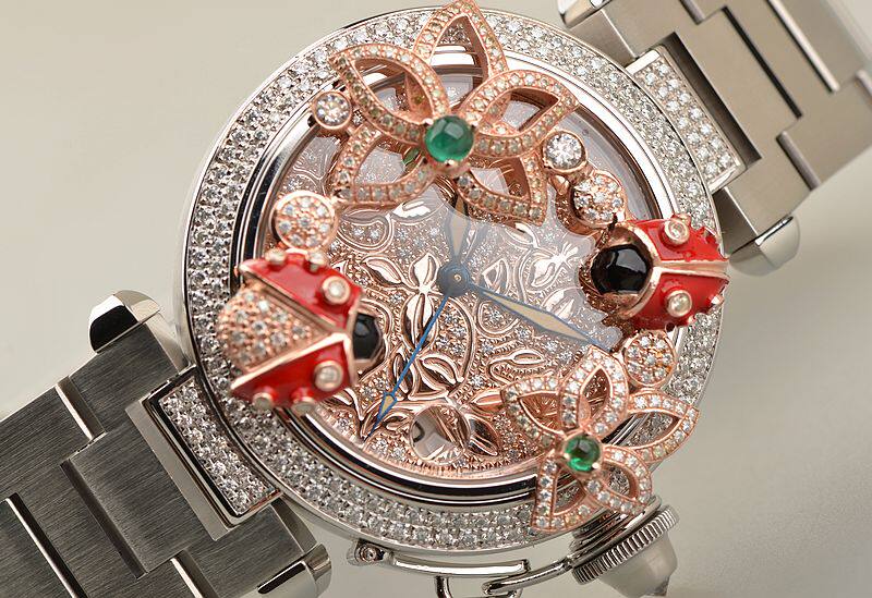 卡地亚帕莎自动机械女表后镶钻七星瓢虫款 口径35.5MM*13MM,后镶顶级豪华天然美钻,防水100M。原镶钻款式定价约100万RMB,现在价格:33800RMB。可配皮带,供色板挑选。
