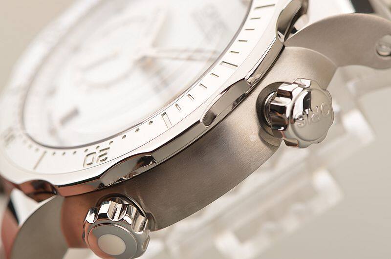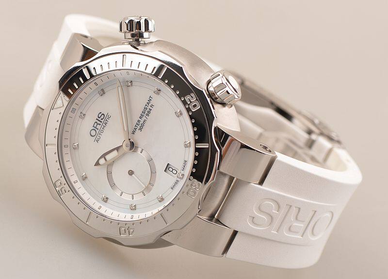钛合金表壳及折叠式双保险专利潜水表扣,原厂白色橡胶表带成色极新。蓝宝石水晶镜面及底盖,立体银白色珍珠贝母表盘,小三针设计,单向可旋转计时表圈,表盘12颗钻石刻度,夜光时分针,6点位日历窗口,8点位独立小秒针。表壳侧面4点位排氦气阀装置,2点位旋入式防水锁把,口径44MM*12.8MM,防水达300M。款式风格男女合用。