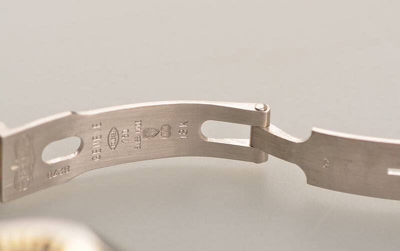 整表97成色新,正常极轻微生活使用痕迹,无明显划痕,无磕碰。印记清晰,拉丝棱角凌厉,表链直挺,指针,面盘均完美无瑕。腕周约165MM,注意手寸合适再购买。整表重约78克,金价都2万多。低调贵雅。
