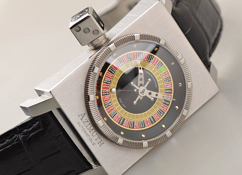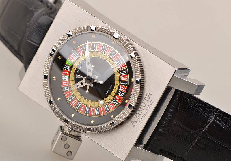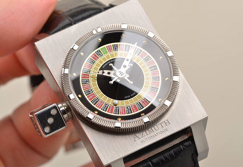 316L精钢长方形表壳及折叠式表扣,原厂黑色鳄鱼皮表带成色极新。蓝宝石水晶镜面,立体彩色国王赌场百家乐转盘赌桌面盘,表盘中央十字型秒针,别具一格的骰子型表冠,可控制赌桌指针随机转动,以供娱乐。口径56MM*34.5MM*14.8MM。防水50M。