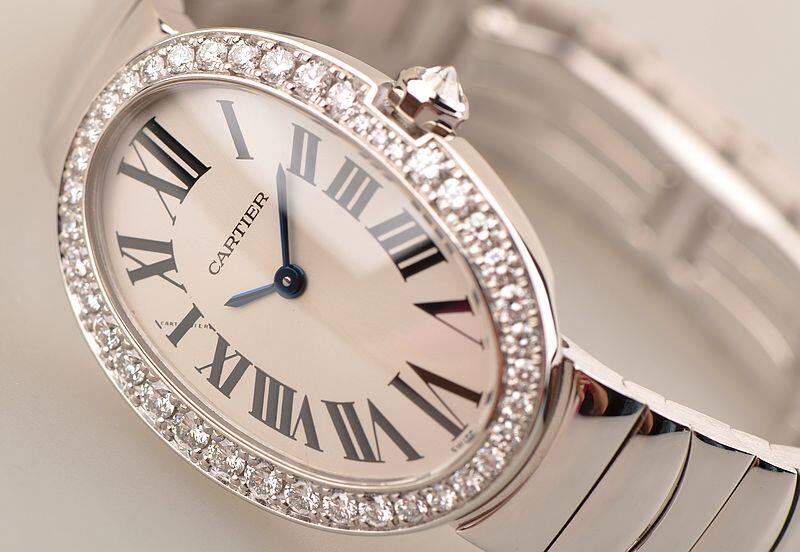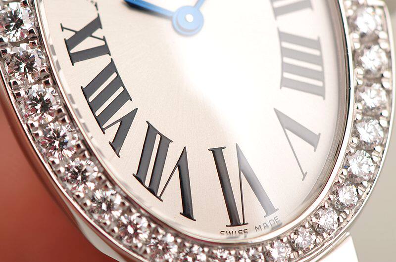 奢华的18K白金鹅蛋形表壳及链带,折叠式表扣,圣伯纳狗头印记。表圈原厂镶嵌40颗ding级天然美钻,蓝宝石水晶镜面,立体银白色表盘,蓝钢时分针,经典黑罗马刻度,表冠原厂镶嵌一颗嚎华大钻。口径31.6MM*24.5MM*8.2MM。相当于圆表30MM左右大小。是该款式中的最大号。防水30M。