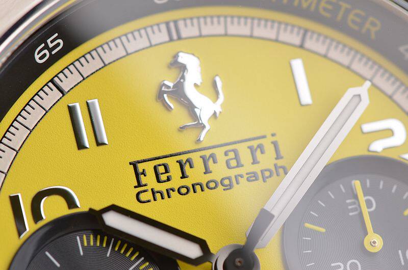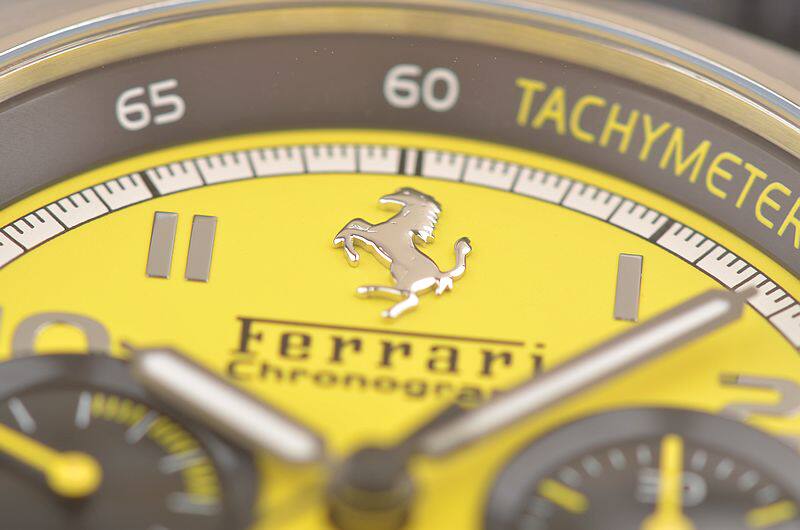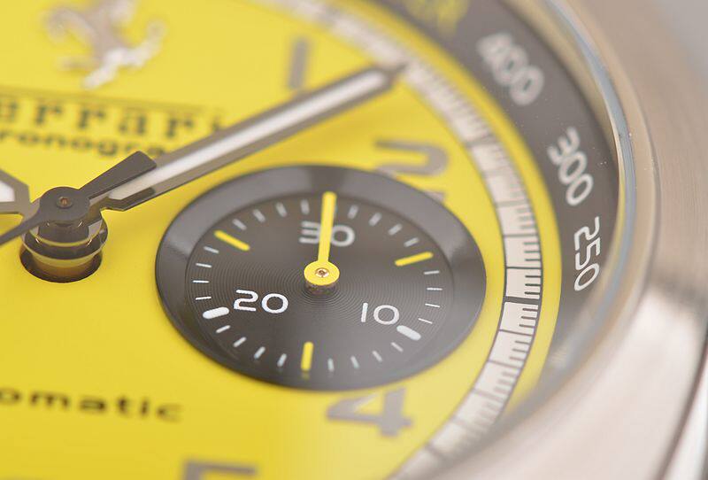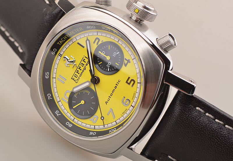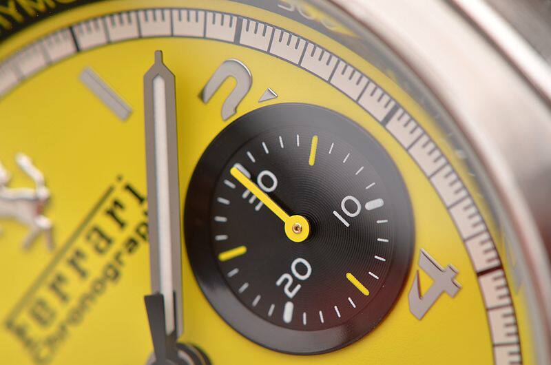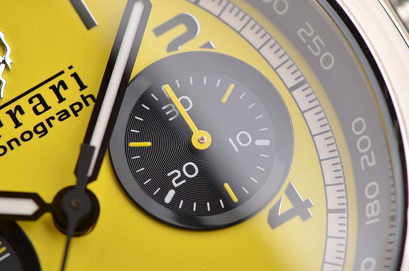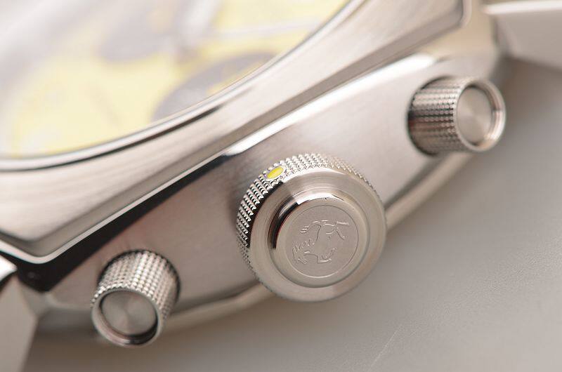 精钢表壳及折叠式表扣,后配全新黑色牛皮表带。蓝宝石水晶镜面,立体黄色计时表盘,夜光时分针,黄色计时指针,9点位独立小秒针,3点位30分钟计时。旋入式防水表把。口径45MM*16.9MM。防水100M。