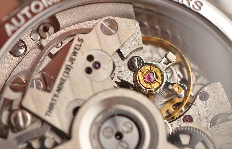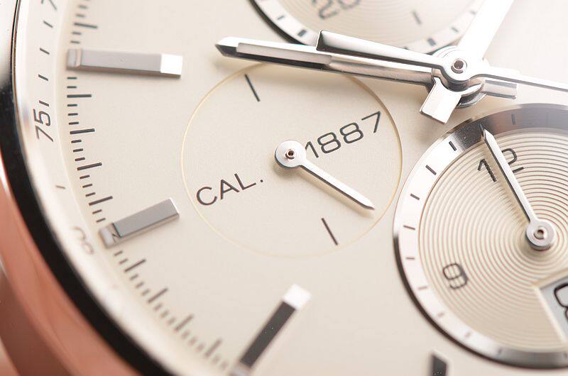 豪雅自产CAL.1887型机芯,自动机械,计时及日历功能,极其精致日内瓦条纹打磨,39钻,摆频28800,动力储存约50小时,走时状态极嘉。