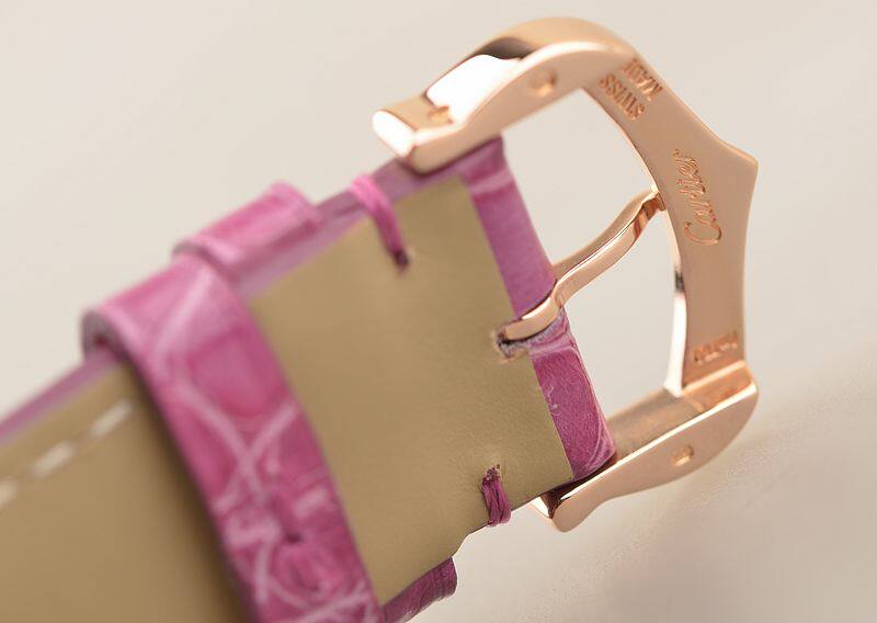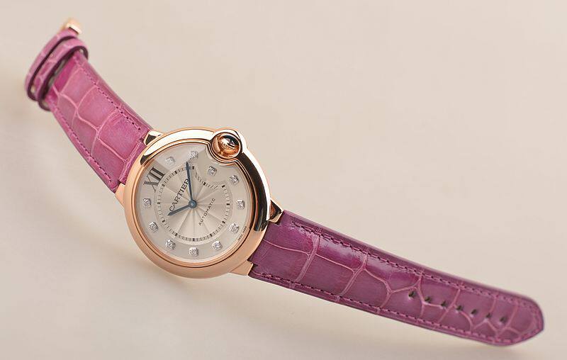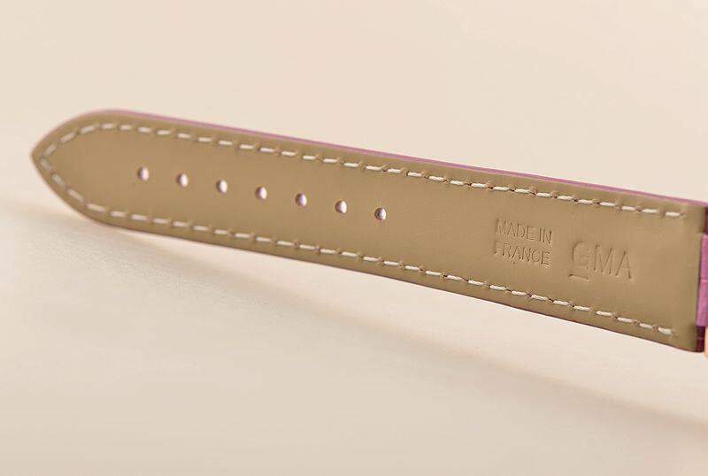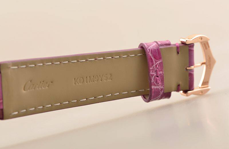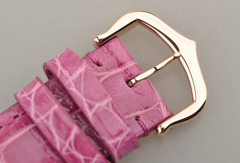 18K玫瑰金表壳及表扣,圣伯纳狗头印记。后配全新紫色鳄鱼皮表带。蓝宝石水晶镜面,立体银白色表盘,原厂钻石刻度,蓝钢指针,蓝宝石表冠,口径36MM*12MM,防水30M。