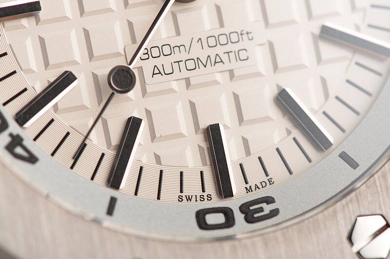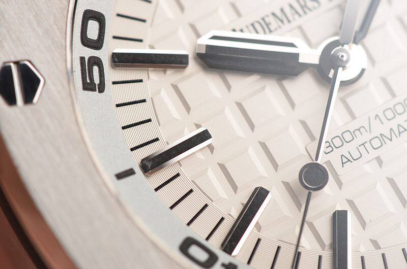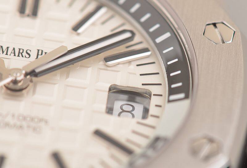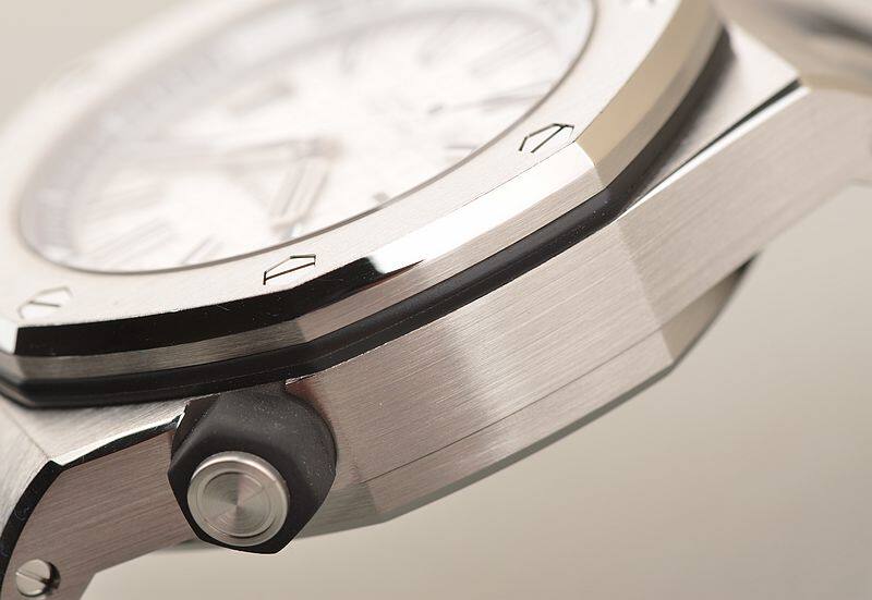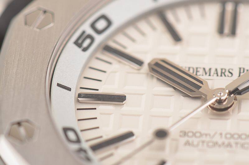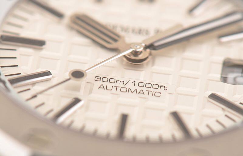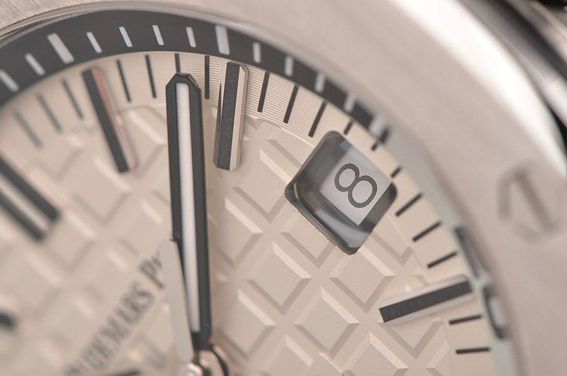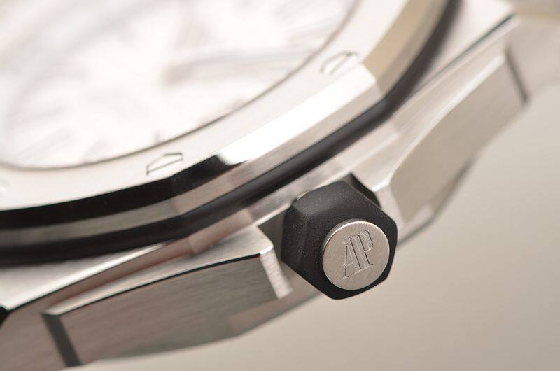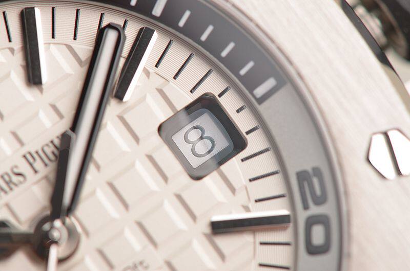 精钢八角皇家橡树表壳及表扣,原厂黑色橡胶表带成色极新。蓝宝石水晶镜面及底盖,立体白色表盘镌刻“Méga Tapisserie”超大型格纹装饰,白金夜光刻度及指针,3点位日历显示功能。潜水倒数计时内计时表圈,旋入式防水表冠。口径42MM*14.1MM,防水300M。