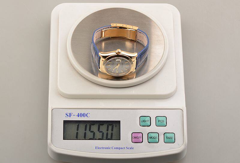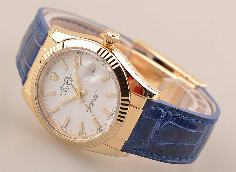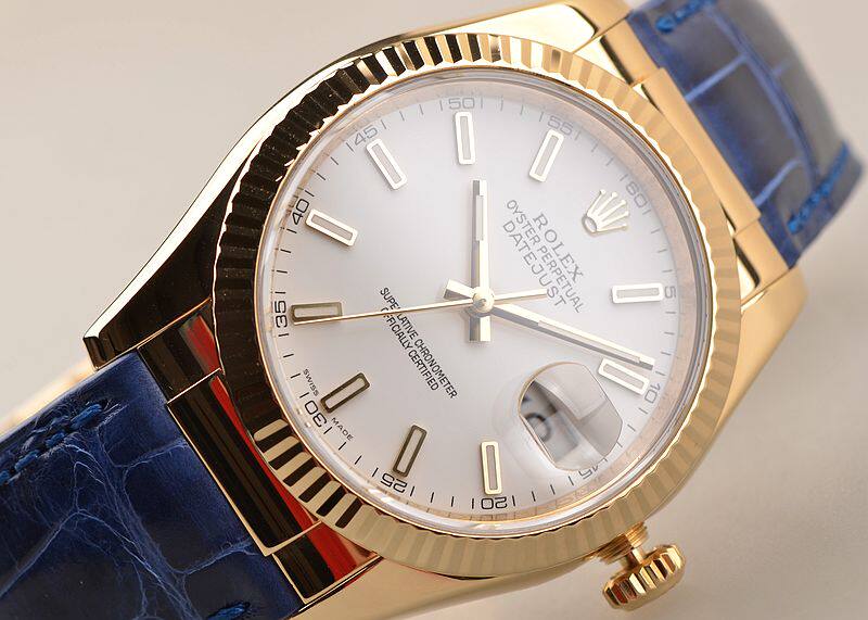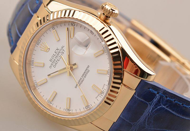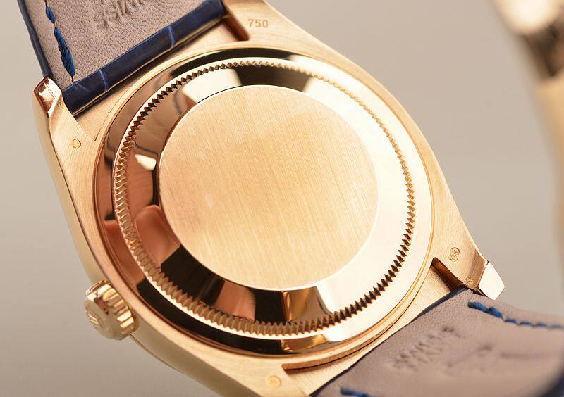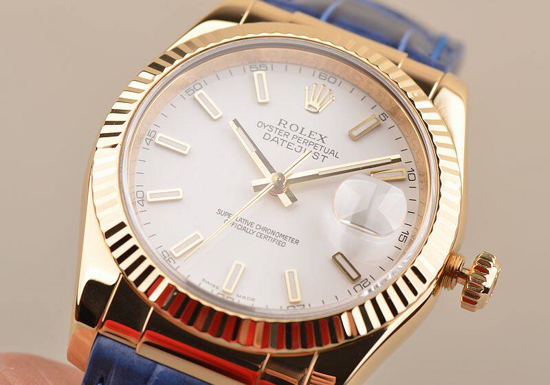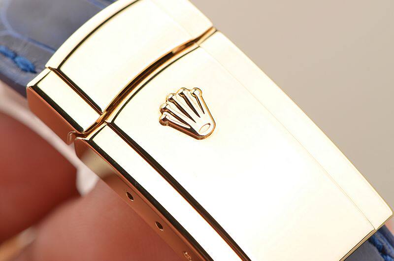 18K黄金表壳及折叠式表扣,18K黄金三角坑纹表圈,圣伯纳狗头印记。后配全新宝蓝色鳄鱼皮表带。蓝宝石水晶镜面,立体低温仿瓷白色表盘,黄金夜光刻度及指针。3点位放大镜日历视窗,旋入式防水表把。口径36MM*12MM。防水100M。