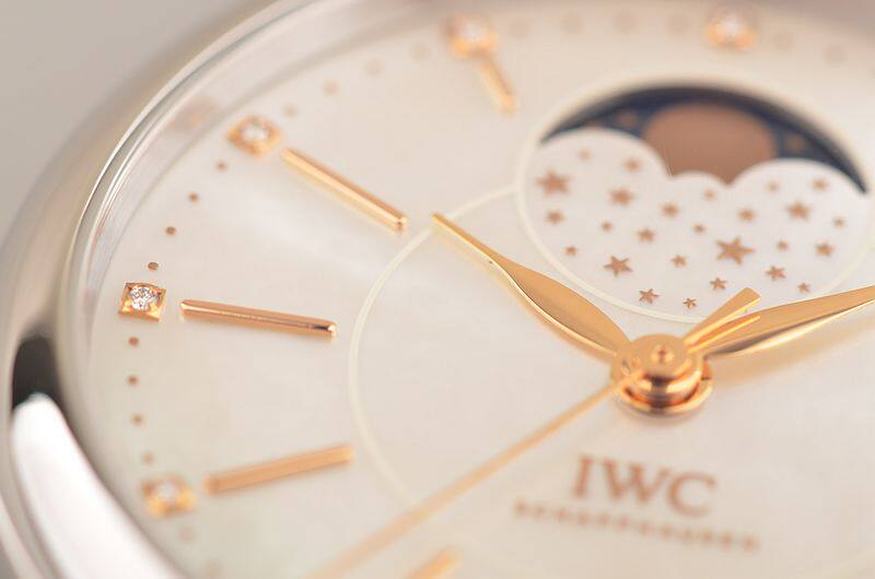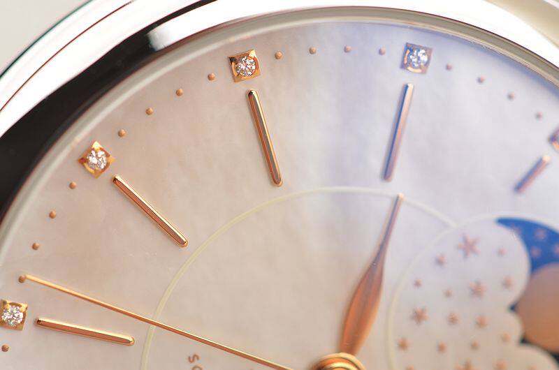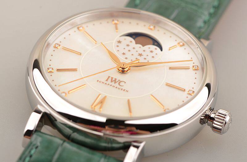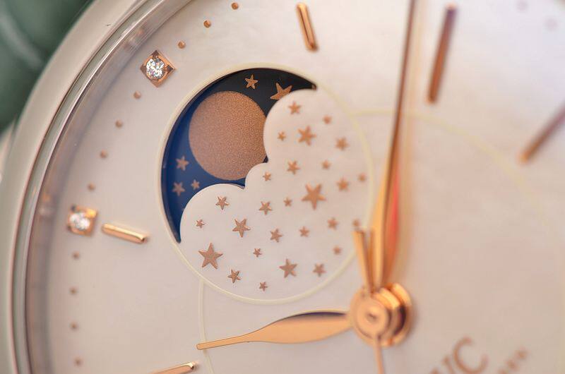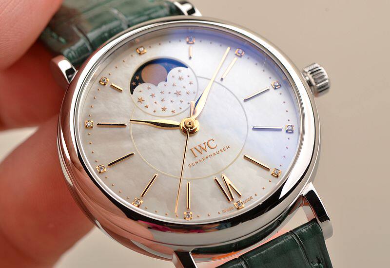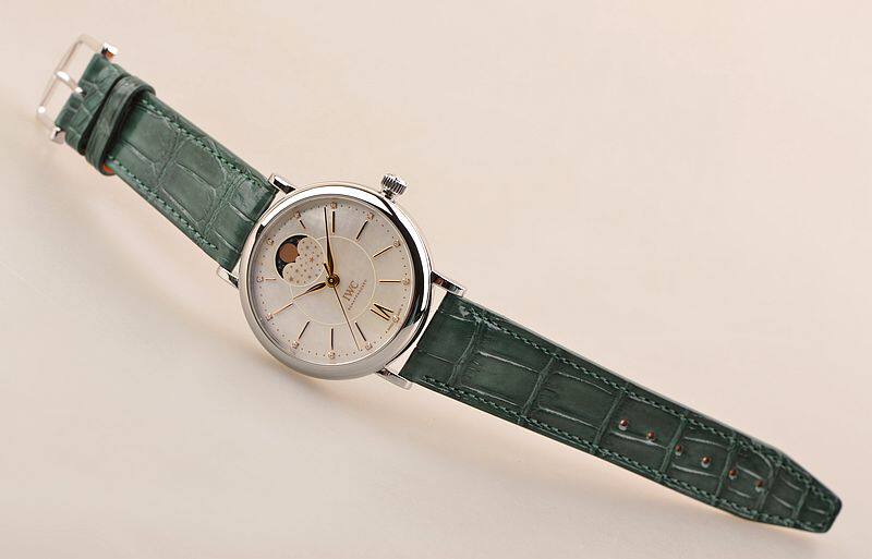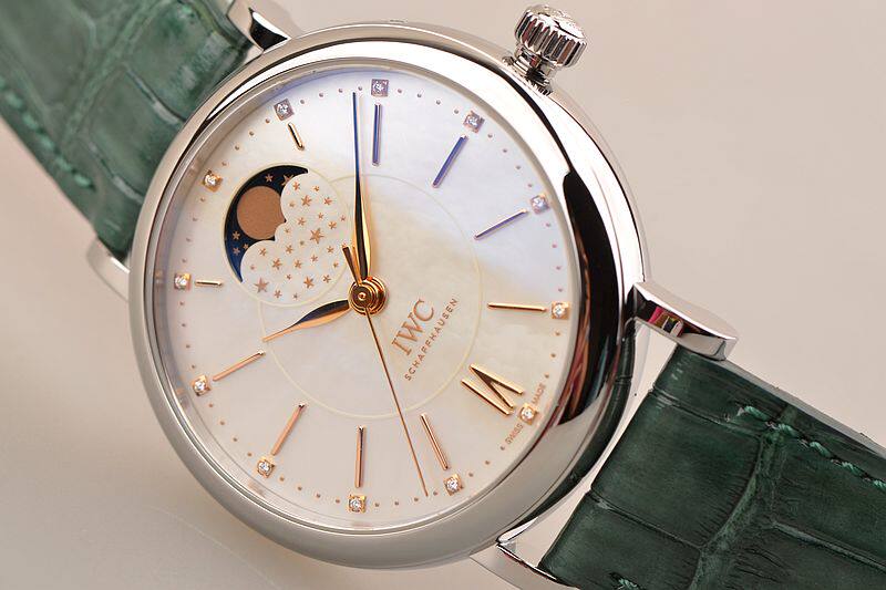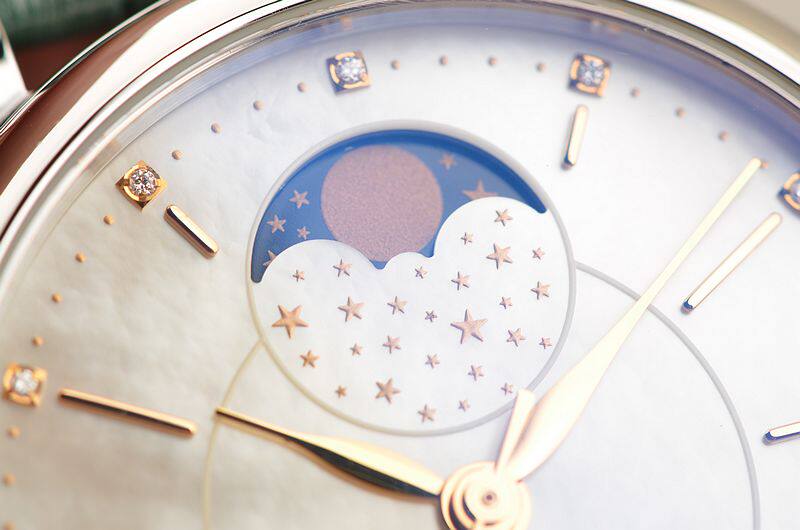 精钢表壳及表扣,原厂墨绿色鳄鱼皮表带全新成色,蓝宝石水晶镜面,立体白色珍珠贝母钻刻表盘,玫瑰金指针及刻度,月相功能。口径37MM*11MM,防水30M。