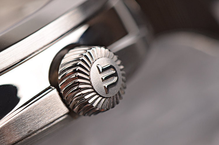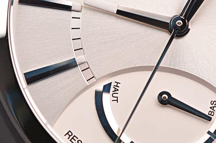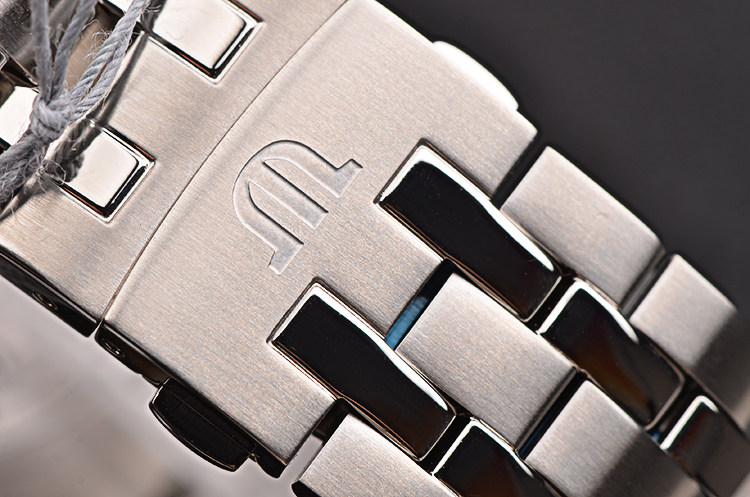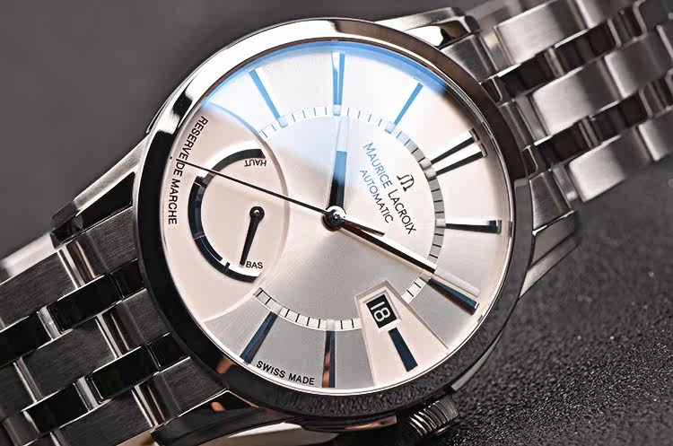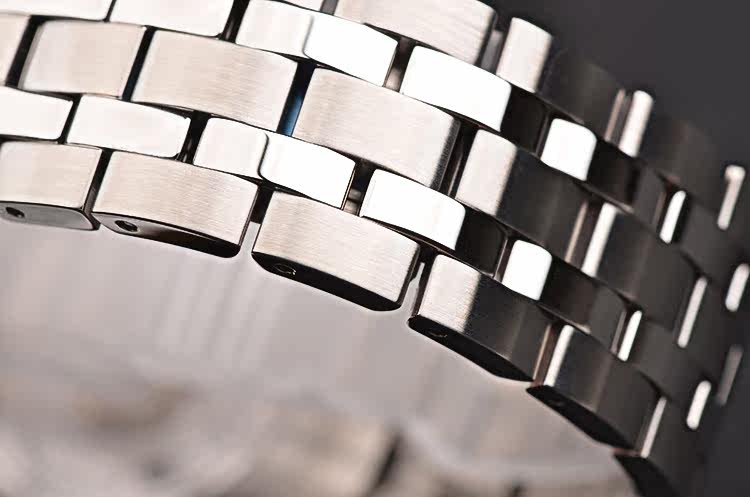 精钢表壳及链带,折叠式表扣。抗反光涂层蓝宝石水晶镜面及底盖,立体银白色表盘,夜光刻度及时分针,3点位日历窗口,7点位指针式动力储备显示。口径40MM*12MM。防水50M。