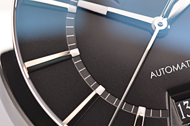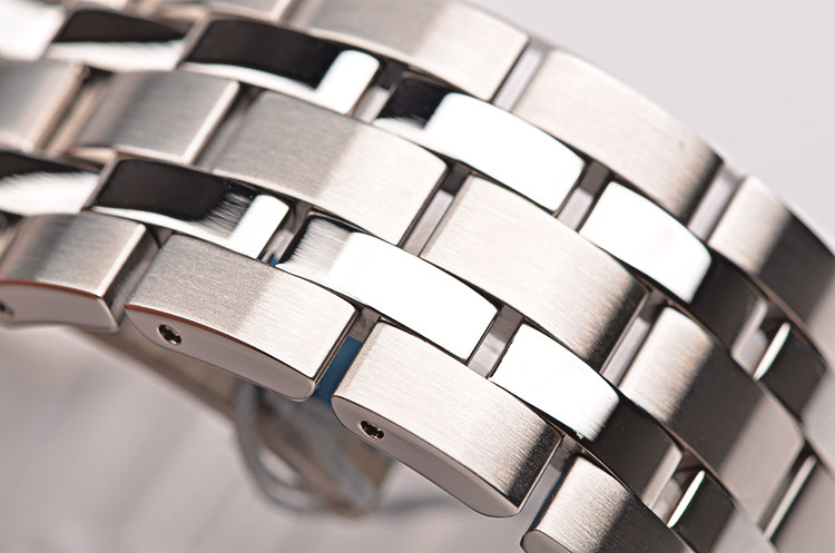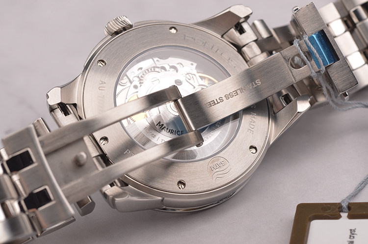 精钢表壳及链带,折叠式表扣。抗反光涂层蓝宝石水晶镜面及底盖,立体黑色表盘,夜光刻度及时分针,12点位星期显示,6点位日历显示。口径40MM*12.2MM。防水50M。