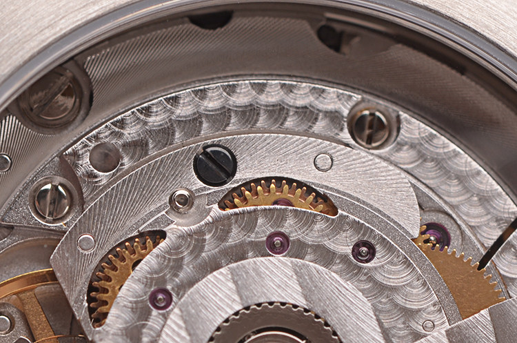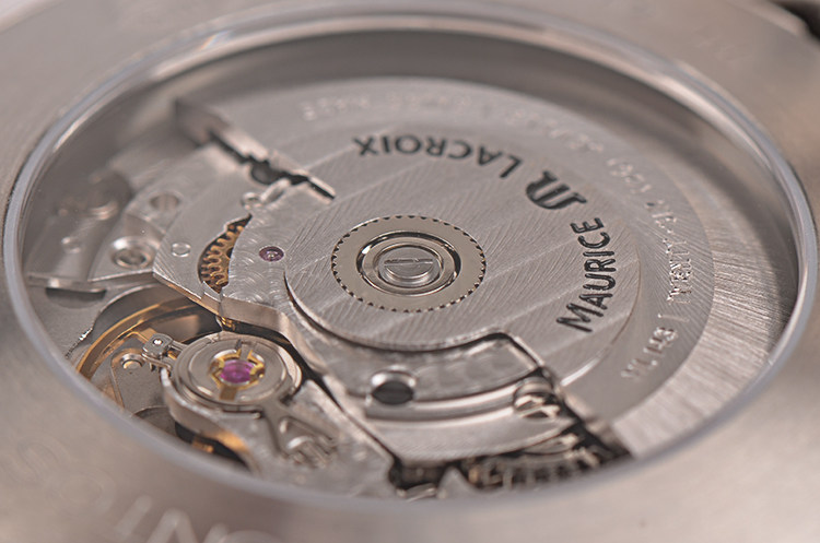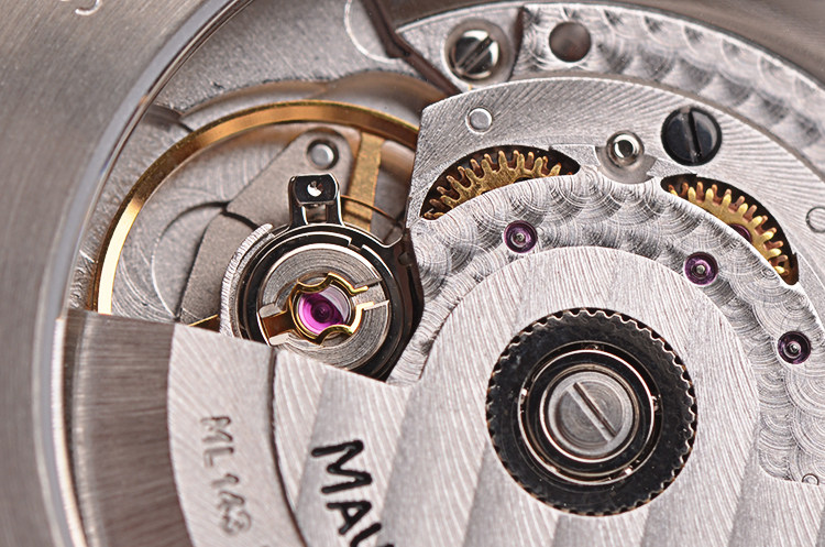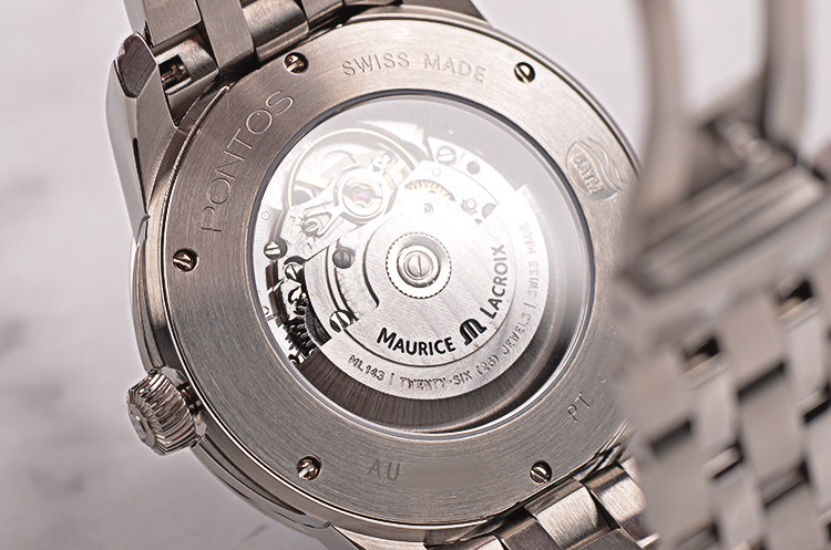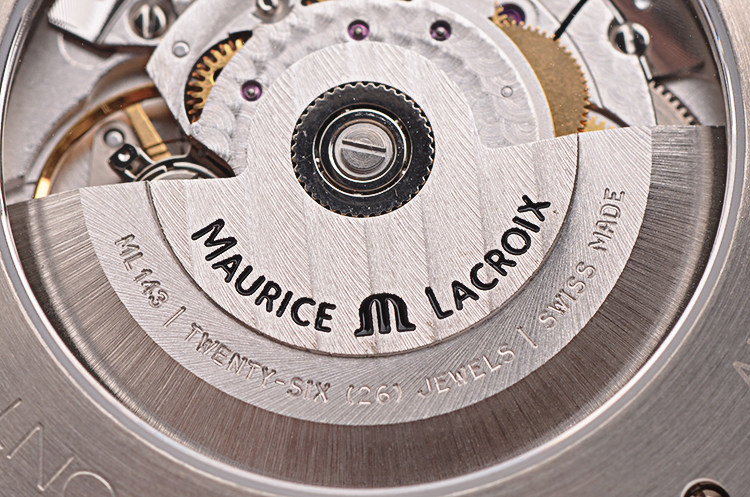 Maurice Lacroix ML143型机芯,自动机械,精致日内瓦条纹打磨,26钻,摆频28800,动力储存约38小时。